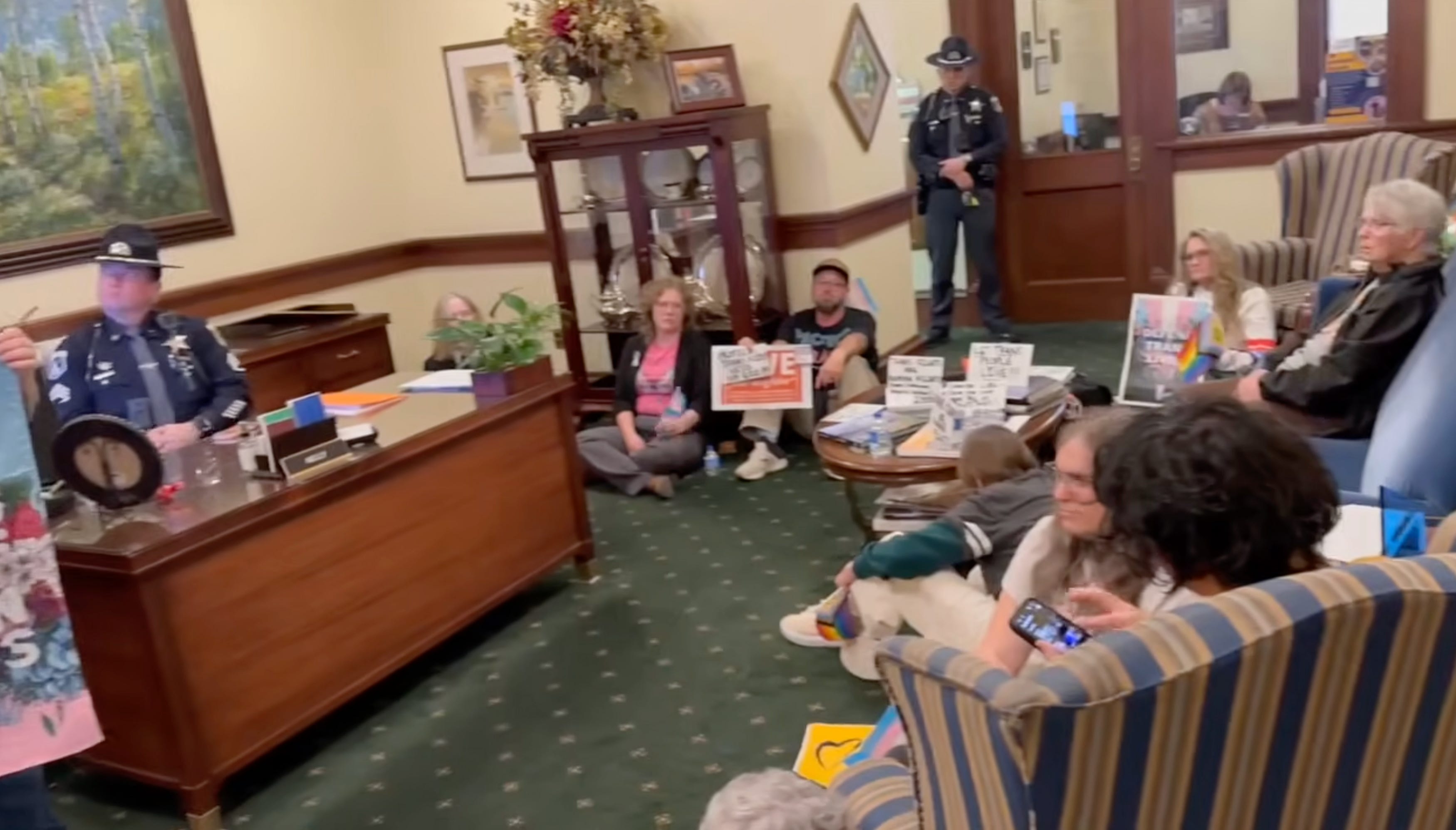 >For more than three hours, over 40 demonstrators—primarily faith leaders and prominent LGBTQ+ local advocates—sat in the entry to Gov. Brad Little's office demanding a meeting. The group was led by the Rev. Sara LaWall, minister of the Boise Unitarian Universalist Fellowship and the parent of a transgender daughter, and Nikson Mathews, a transgender activist who served as a substitute state senator last year. Before entering, LaWall read a prayer: "We pray for protection, for dignity, for life. Guard them from harm, from fear, from laws that would erase them." Protesters sang for hours, held trans pride flags, and wrote notes to the governor. Little refused the meeting. A staffer told them the office closed at 5 p.m.