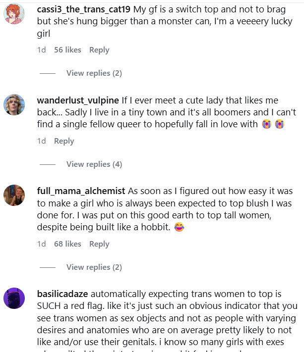 >>43148530yeah i mean kinda gross if they have a fetish for us but i wont lie topping a trans woman is prob the easiest way to get to her heart