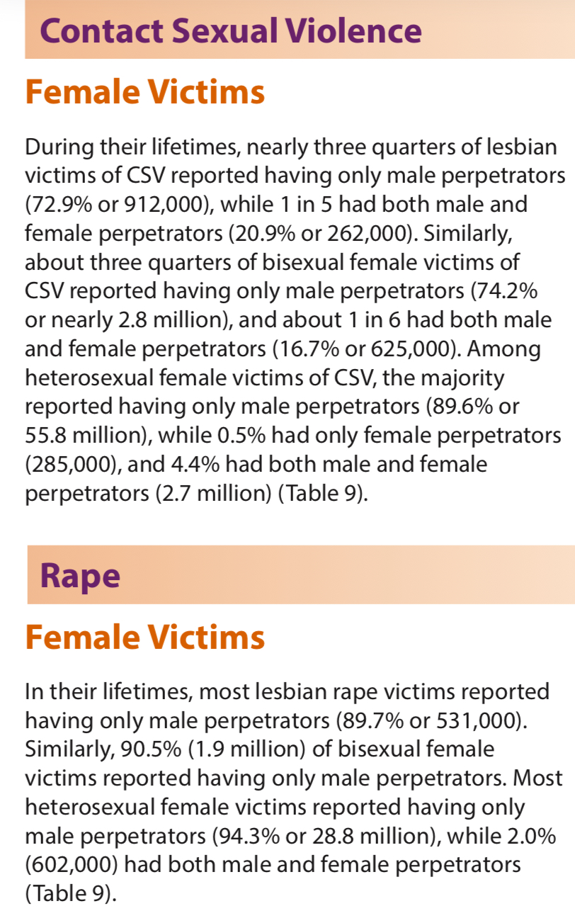 Whether you think they’re lesbians or not, the CDC decided to allow self identification and therefore the lesbian victim numbers includes lesbians that dated men in the past.