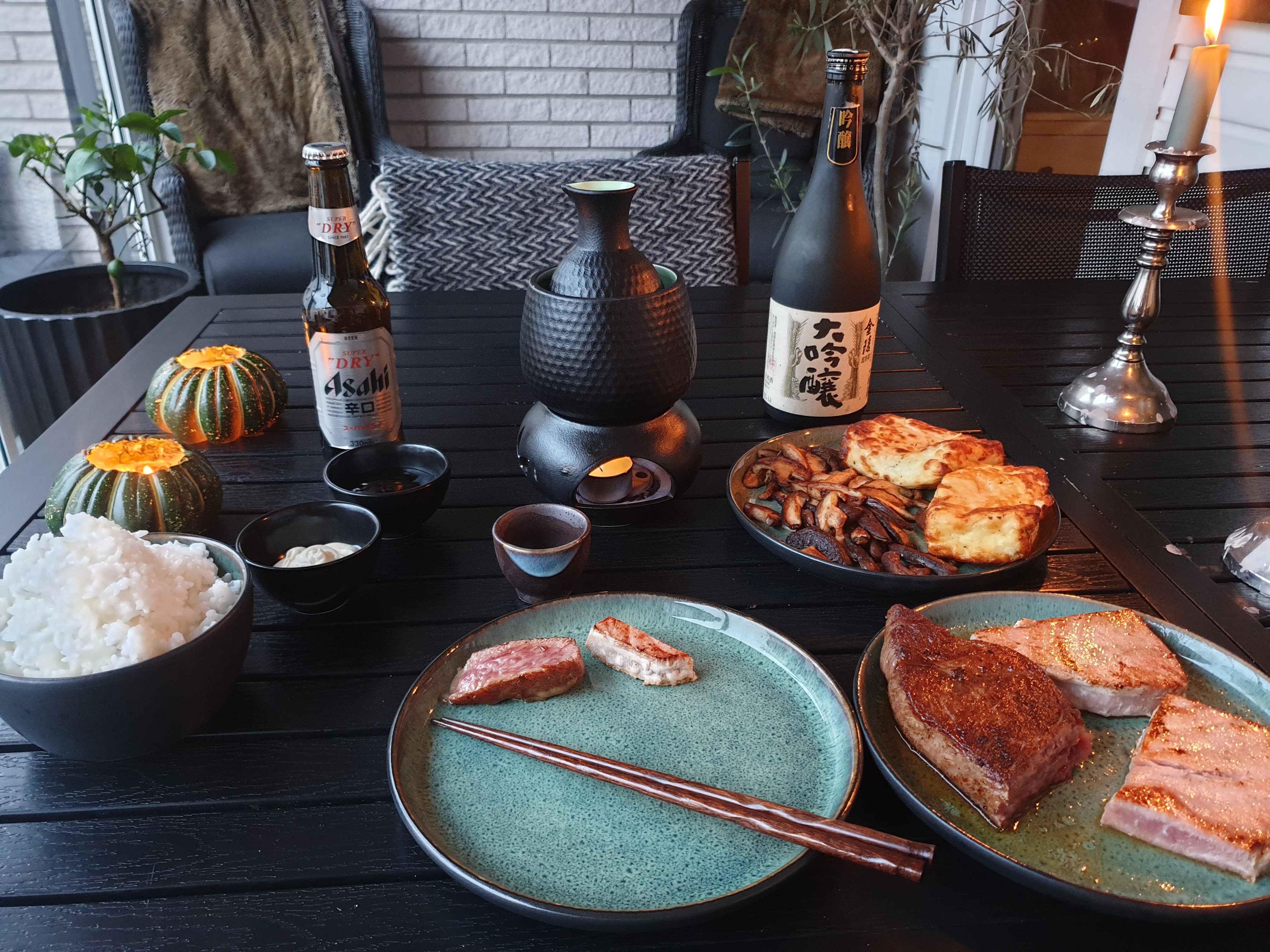 one does not eat like this often :-Dtuna steakwagyuhalloumishiitakericebeersake