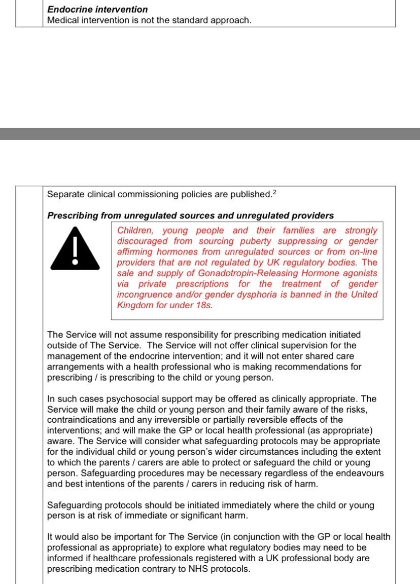 >>43166593Basically no private care working with GPs and no blood tests through the NHS while also scaremongering over DIY. About two thirds of the way down. Entire document seems to fearmonger over the risks of transition, including social transition. It wants to seem neutral but its doing the "well some people say it's harmful so erm ackchually"