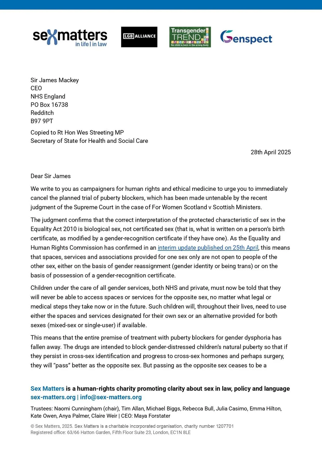 >>43167330never forget this letter from sex matters to NHS chief lmao1/2>passing as the opposite sex ceases to be a desireable goal to present to children when they will never be permitted to use spaces or services for the opposite sex