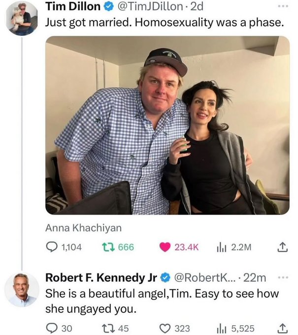 I just discovered Tim Dillon a week ago and have been loving his rants and comedy. I was surprised that he identifies as gay. He's the big guy in this pic. He said the post was just a joke, of course.