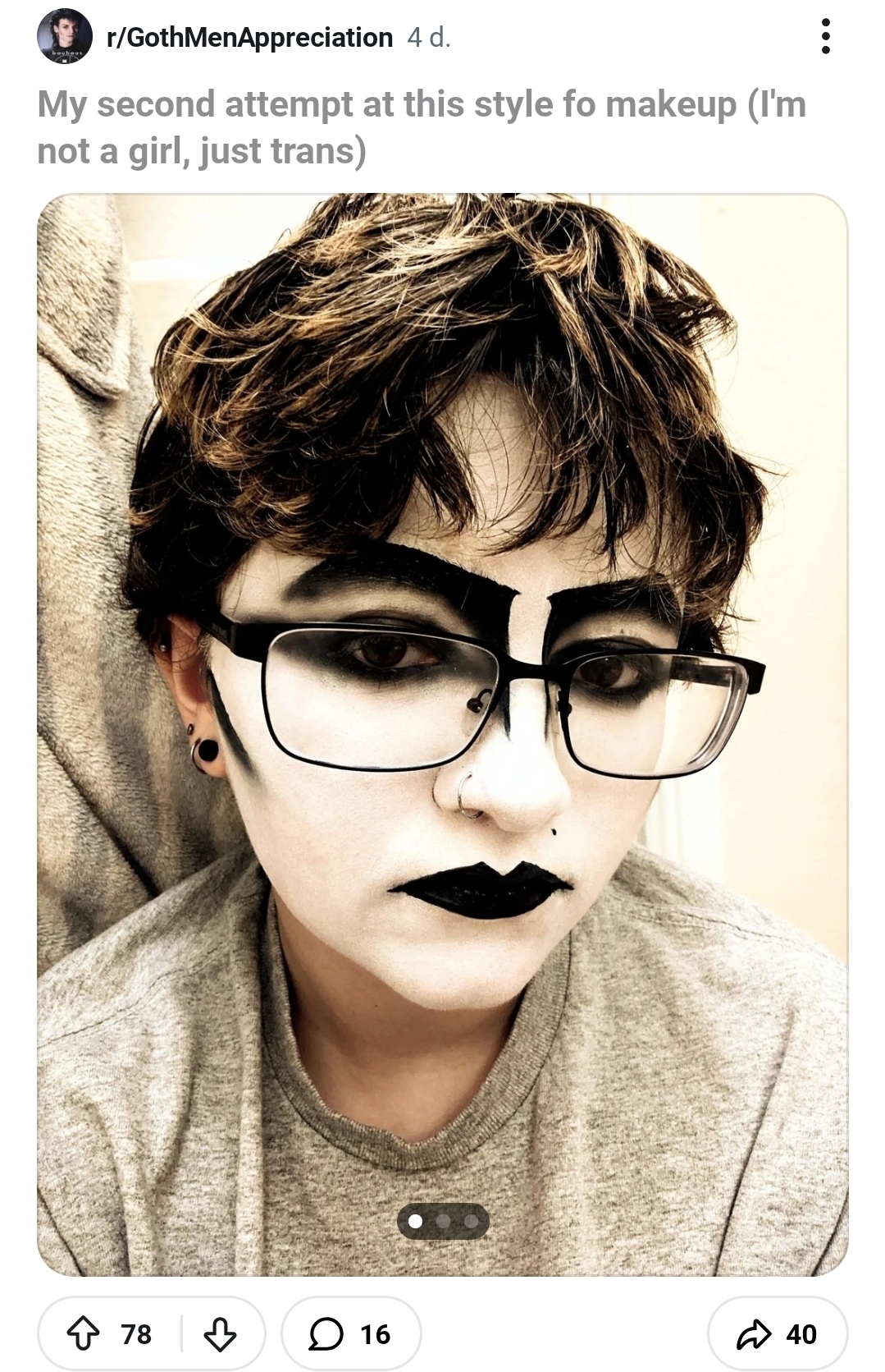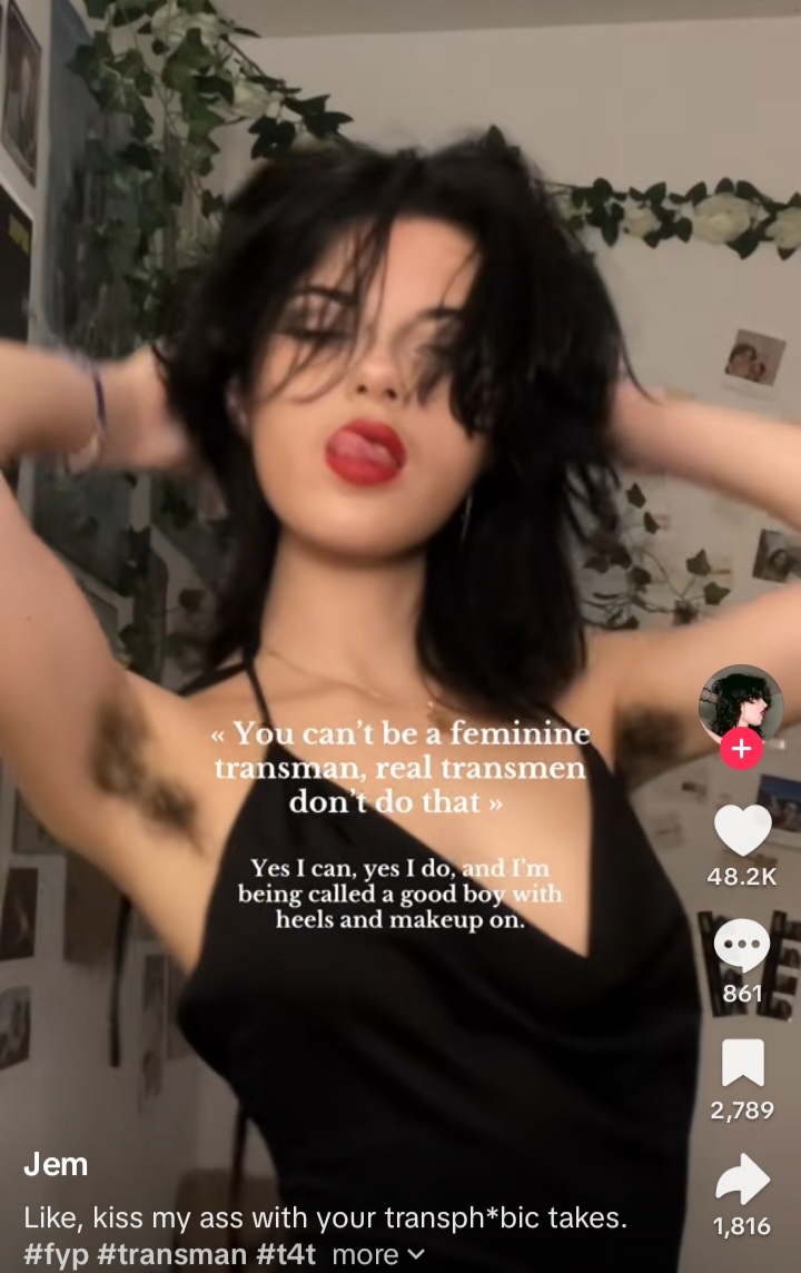 >>43184438Oh wow really is passing as your chosen gender a "con"???I will say though, there is definitely a trend among younger gay and trans people to "look" trans. Like they don't want to pass they want to be identified as queer, publically, at a glance. It also means that those of us who don't "look" queer get overlooked, b even by other queers. Hilarious.