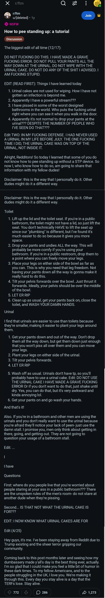 >>43185227Why are pooners so obsessed with pissing standing up anyway? I'm a cis dude and I sit down any chance I get. A king needs his throne.
