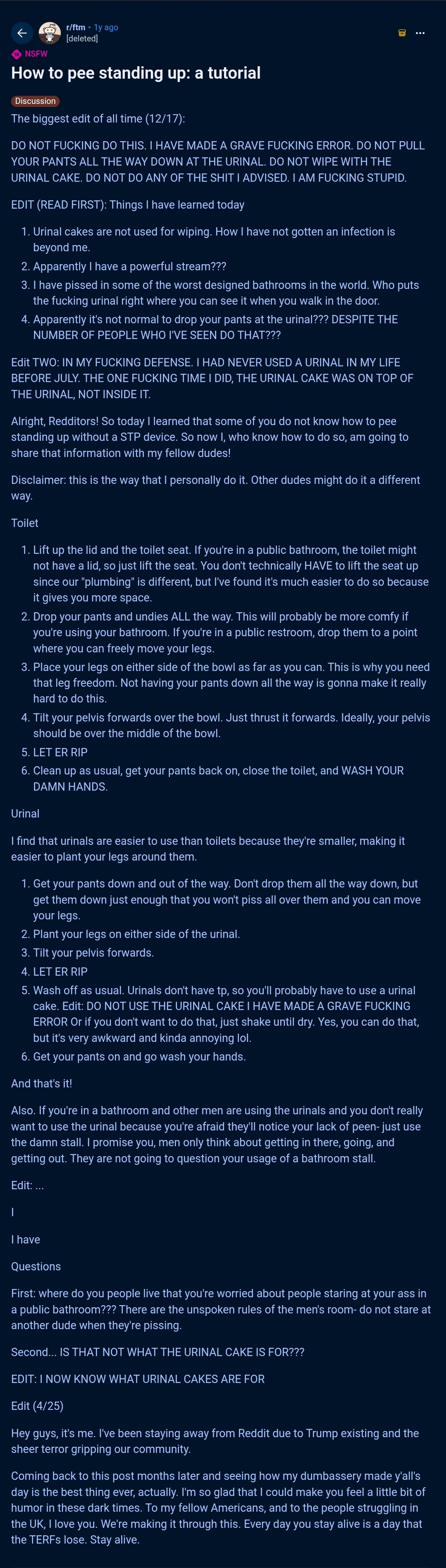 >>43184438>>43184456>>43184644>>43184672>>43184687You guys know that this sub is like /detrans where 90% of the posts are creative writing exercises by cis people, right? That isn’t the actual ftm sub. There are basically no ftms on reddit and they don’t go there. They’re in the private one.