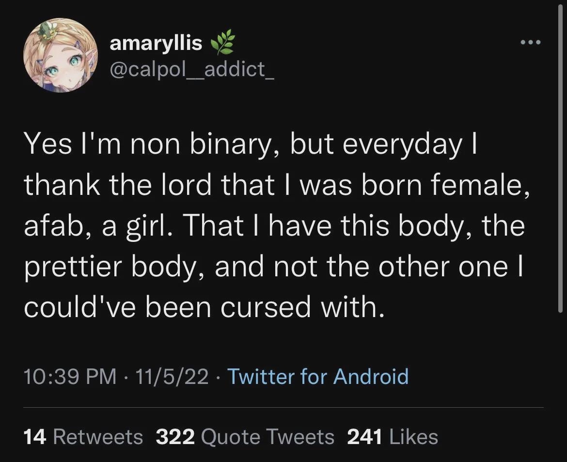>>43184438reminds me of how dr powers saw so many LARPy ftms that he just started giving them estrogen and they self-corrected out of identifying as a "man" within like 3 weeks lmao.Ftms are not real 99% of the time.