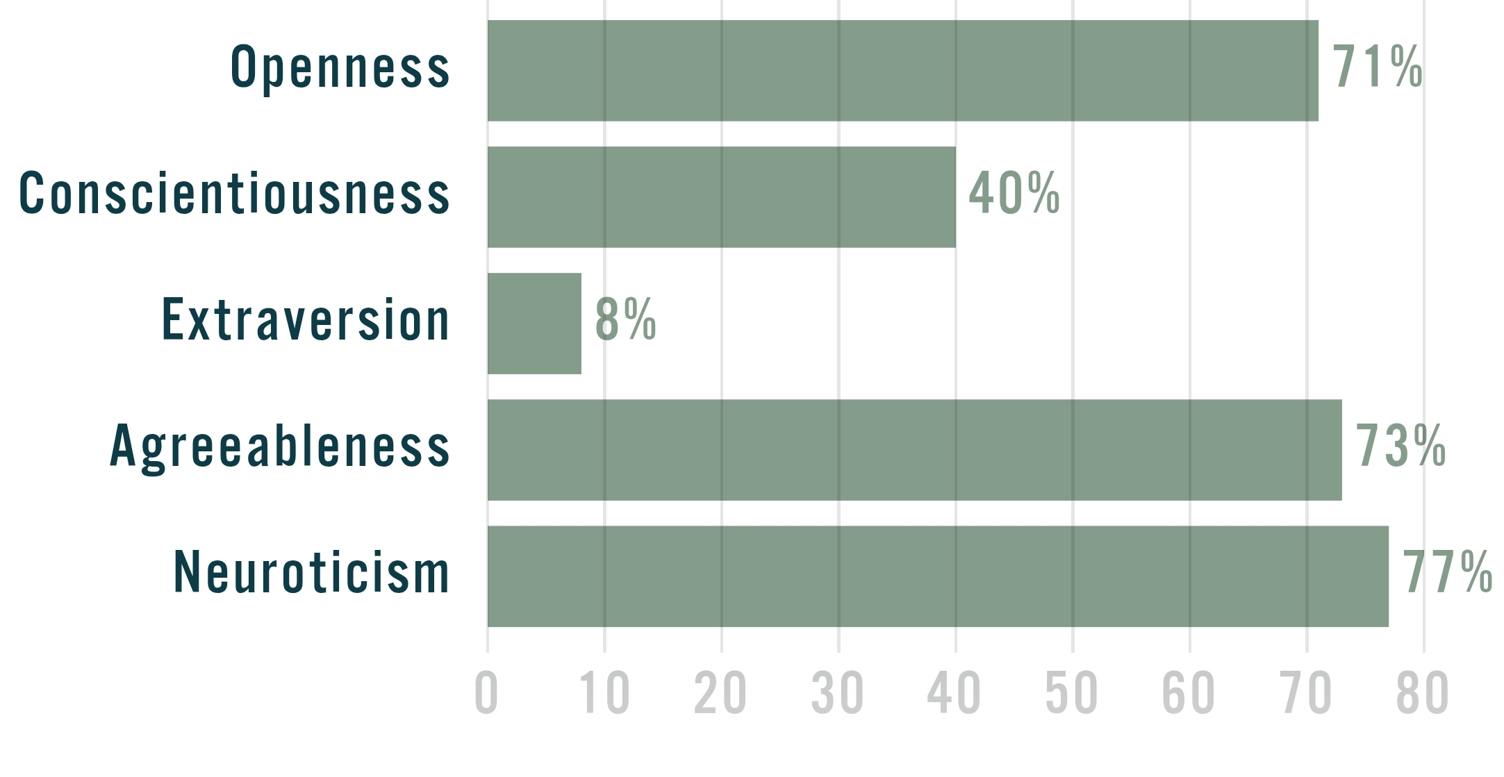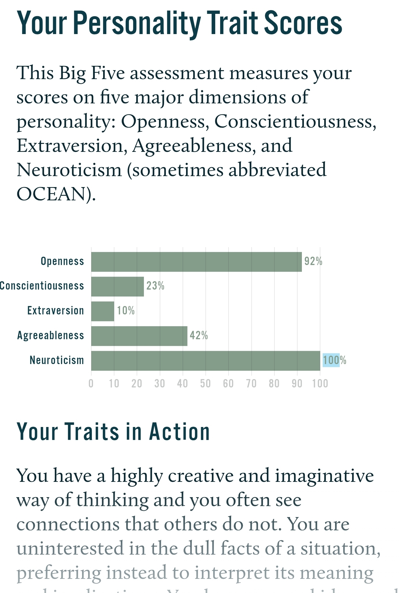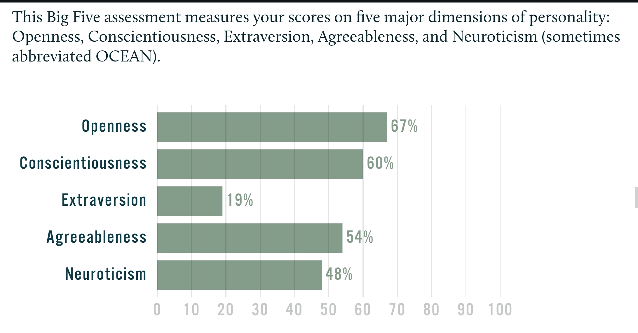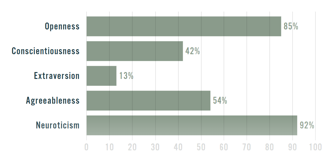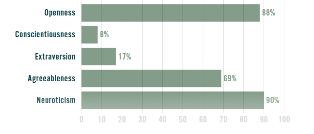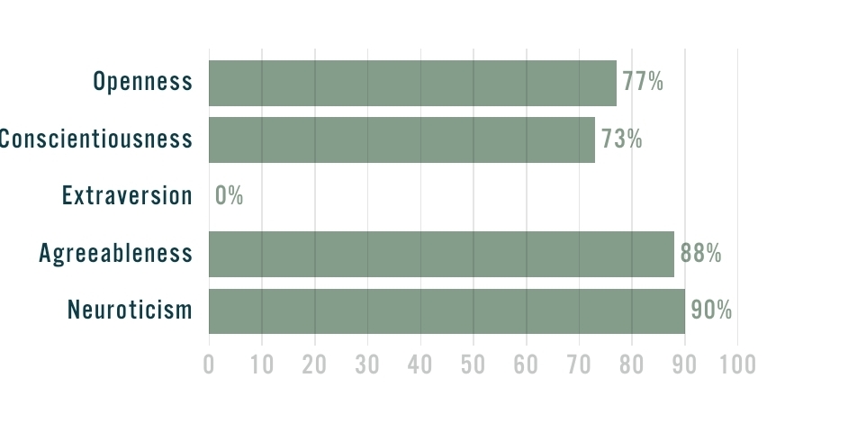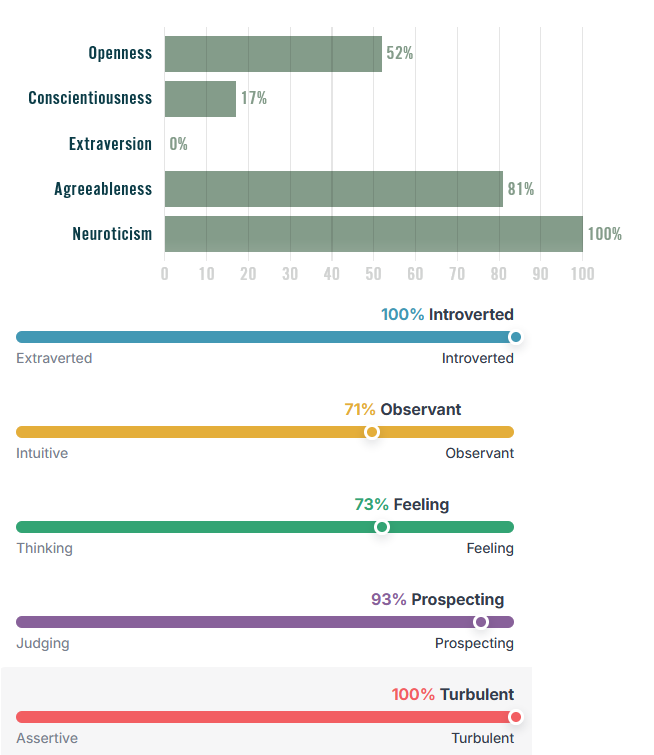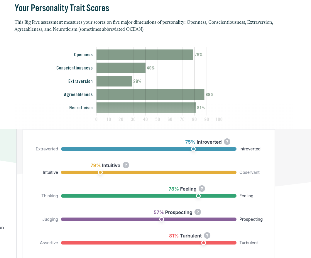 >>43186714average>>43186829mogs me, pass>>43187170the neutoticism and turbulence is the same thing. get into therapy and take ur meds please, also pass.>3 100s>Neurotic and Intraversionthose are like the bad ones :c and like 0 or 100 is kinda the same thing between these, so in a way u got 4 100safaik like every 10% is a standard deviation into agreeableness so v fem.. and like normally cis women avg like.6 SD above avg for agreeableness.