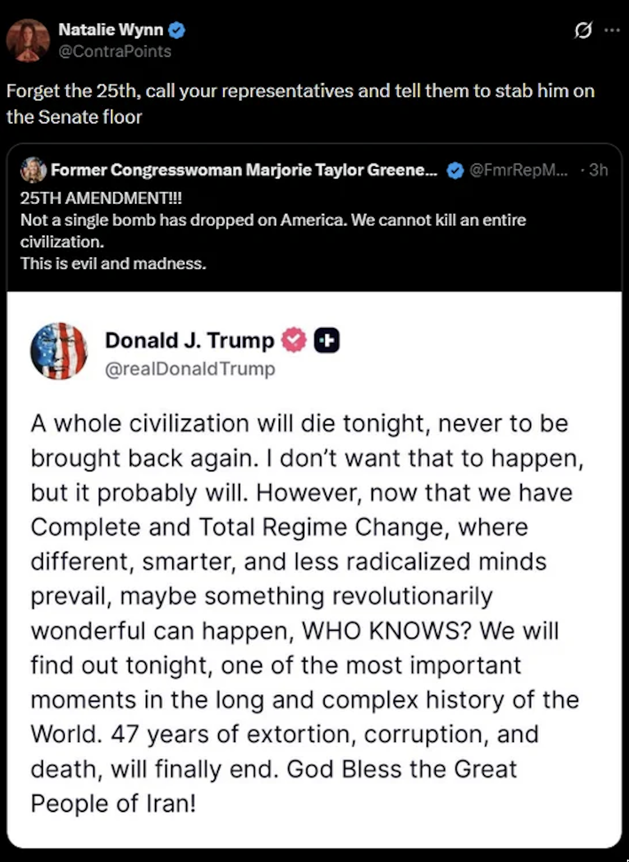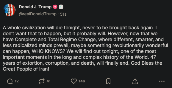 >>43186945Unfortunately I think the "nothing ever happens" crowd will be proved wrong tonight, Iran has made a pretty big show of calling Trump's bluff and the Strait of Hormuz isn't really something Trump can walk away from, it's a damned if you do damned if you don't situation at this point