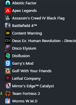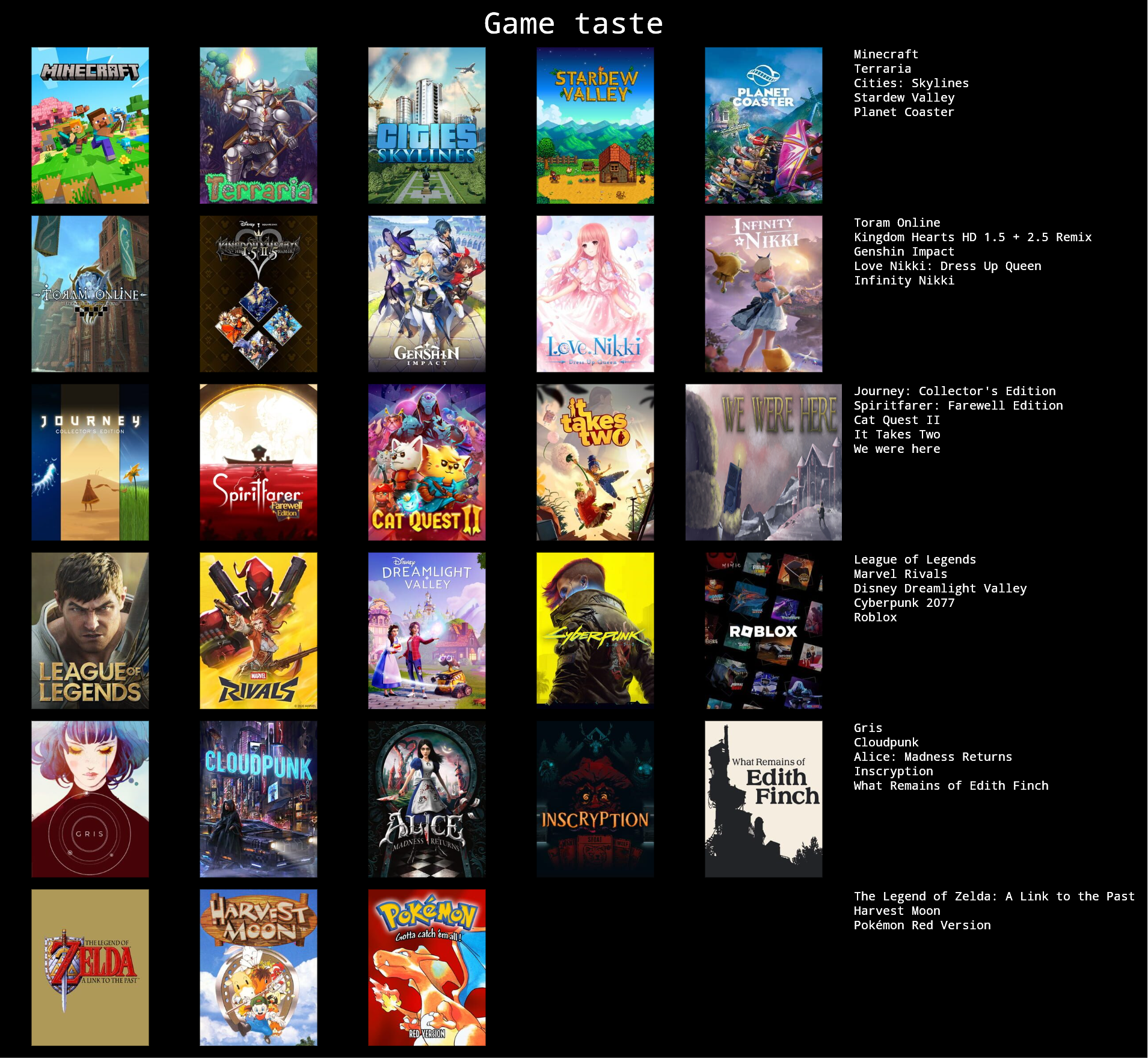 I don't have a game library, but I've played genshin, identity V, Minecraft, hayday, and ark