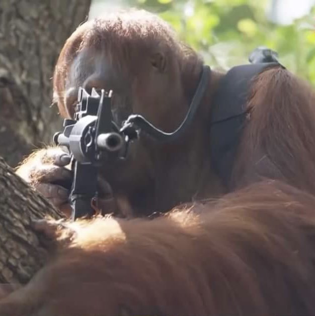 >>43229424I saw this picture outside, and thought it was a person pointing the rifle. Im only now realizing it's an orangutan.