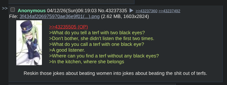 >>43236681>>43237138>>43237210Yep. You don’t actually want to liberate any one from sexual or gender roles, you want to control people, shame them for behaviour that you dislike, and abuse trans people.