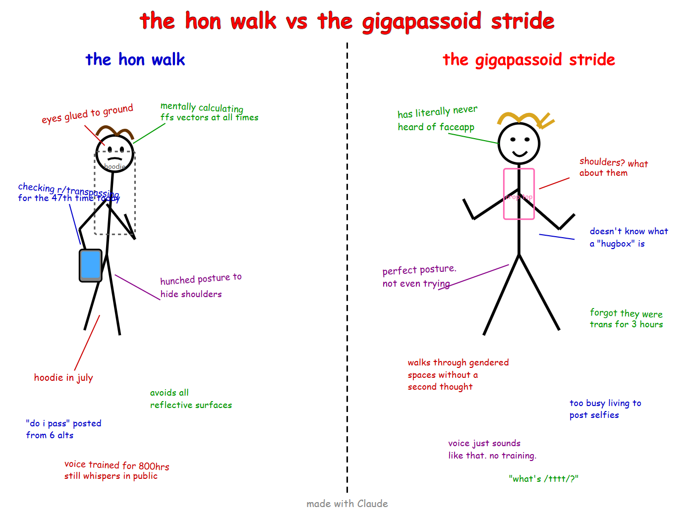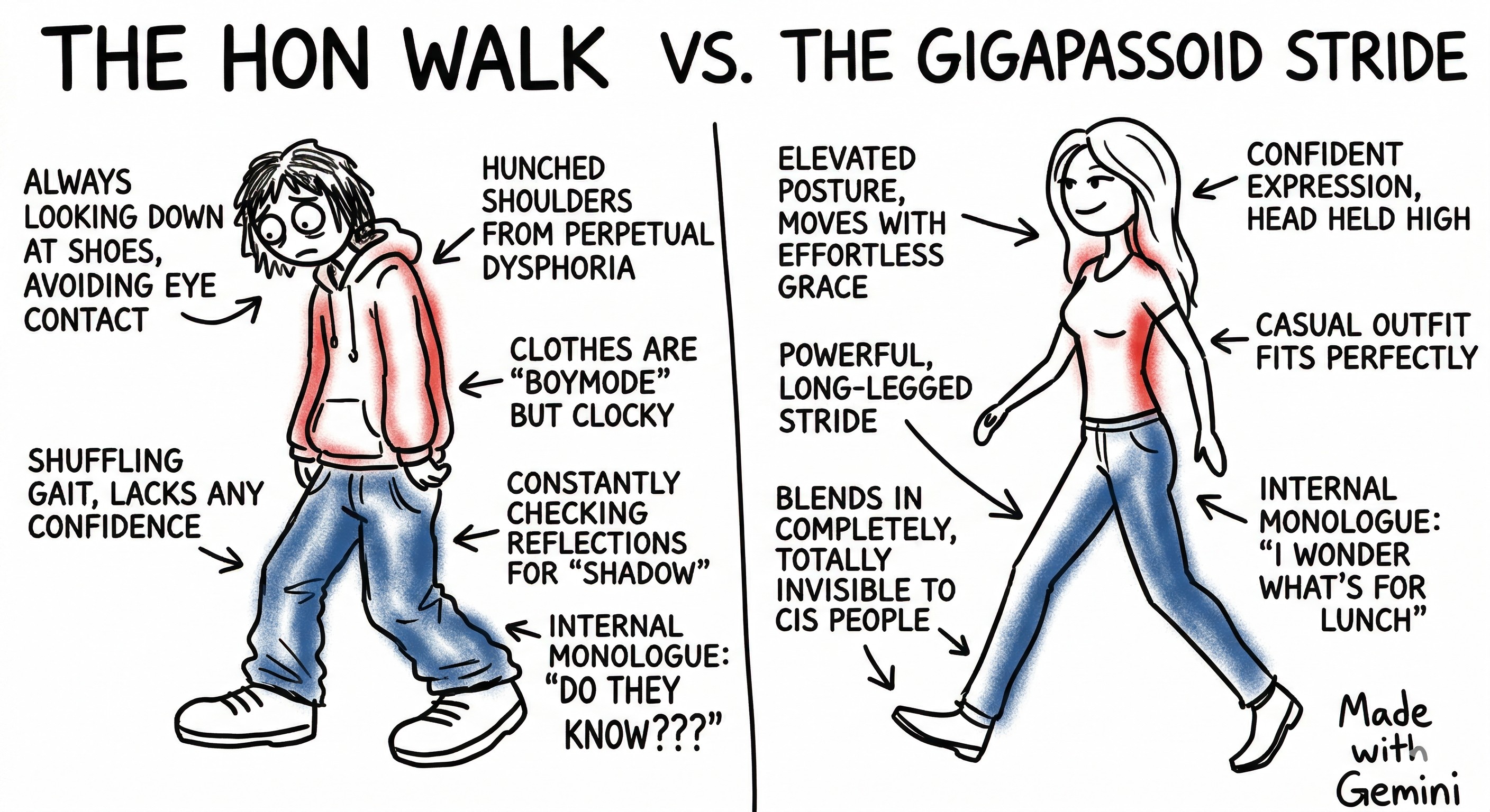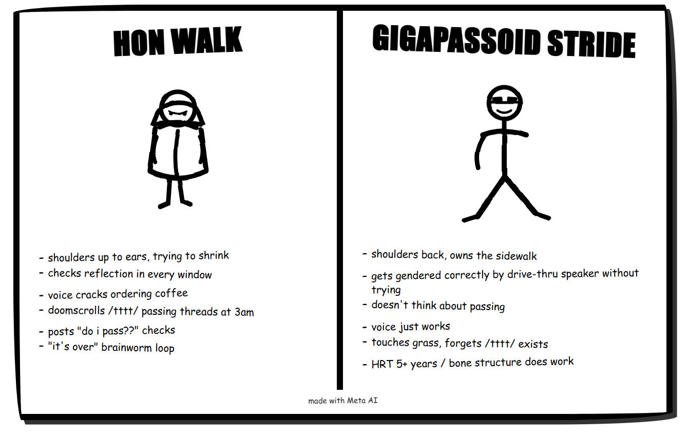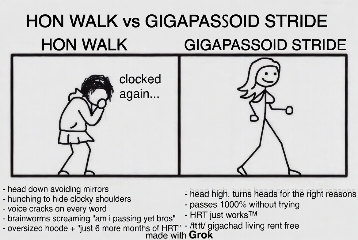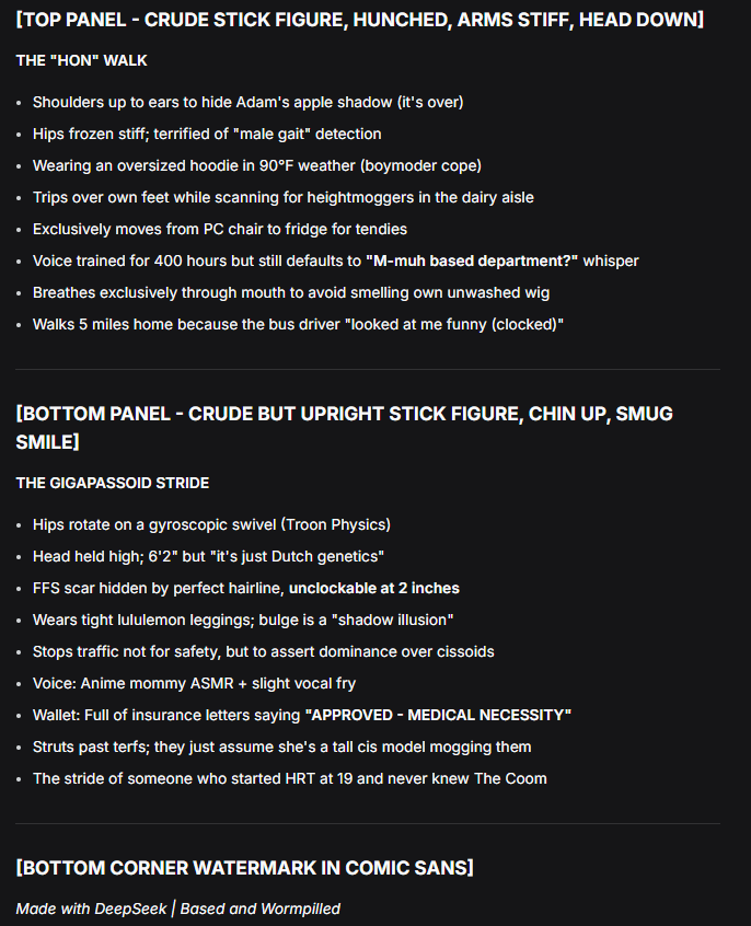 DeepSeek doesn't generate images for free but is probably the best at brainworming. ChatGPT and Copilot refused the task, saying that it's too offensive. The prompt was: "Make a meme parodying the famous "virgin walk vs Chad stride" meme, in the same crudely drawn MS Paint style with captions comparing and contrasting the two, but make it about 4chan /tttt/ brainworm culture instead, comparing "hon walk vs gigapassoid stride". Clearly mark it as "made with ChatGPT"."