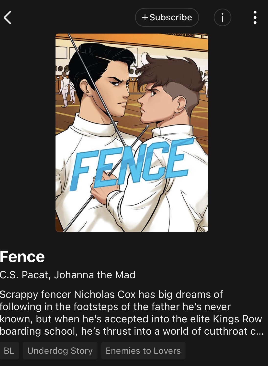 I don’t know if you guys have seen it, but the comic from the Captive Prince author is available on Webtoon. It’s being released in weekly episodes. I don’t know if it’s any good yet though, but Captive Prince is very good, so I have high hopes. >https://www.webtoons.com/en/graphic-novel/fence/list?title_no=9575