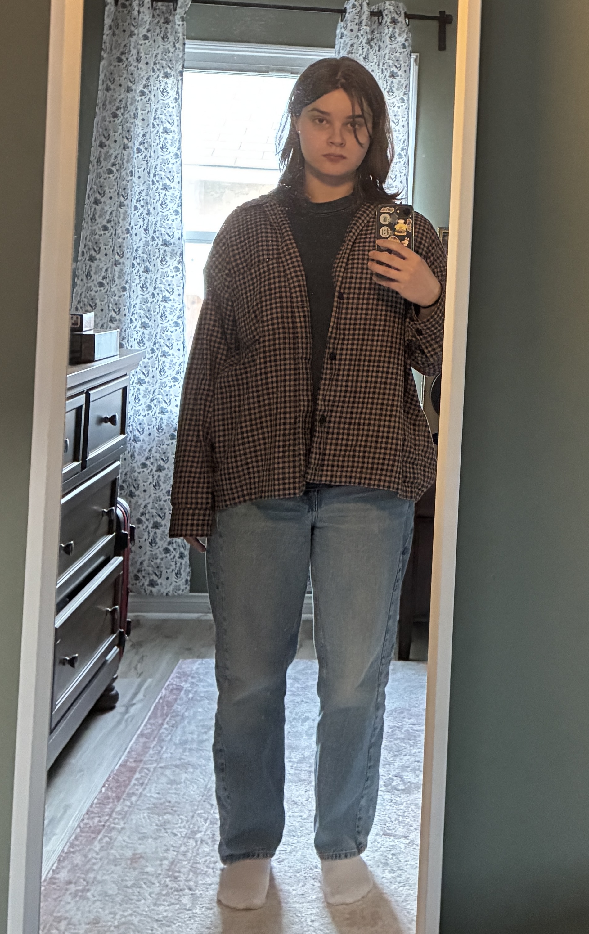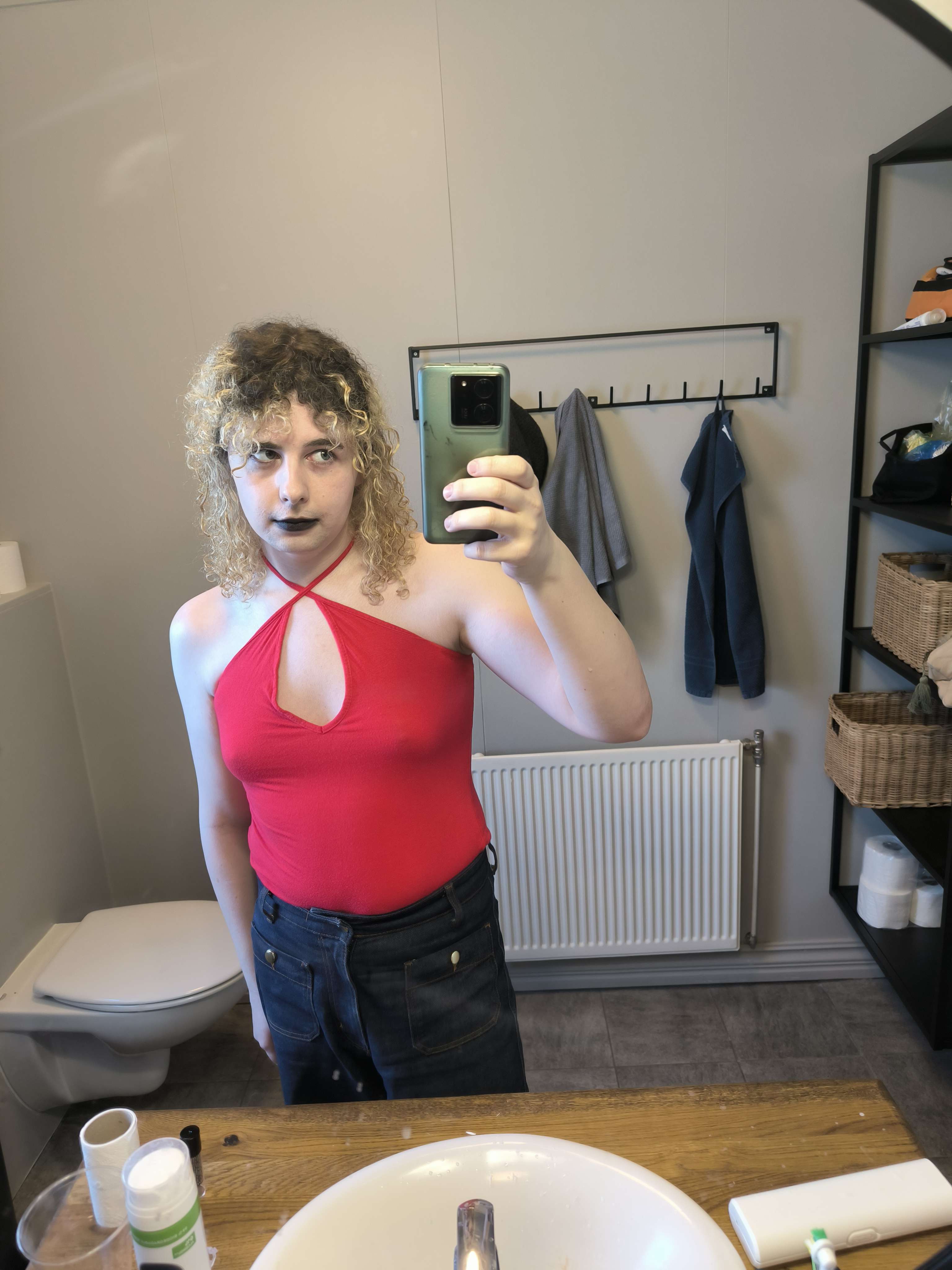 >>43259849dont listen to the other anons i think you look really nice and you have a lot of potential your face shape is really feminine and your shoulders arent big, but maybe something to give you a smaller waist would go a long way, or maybe even more high waisted pants, also are your pants on backwards?!?!