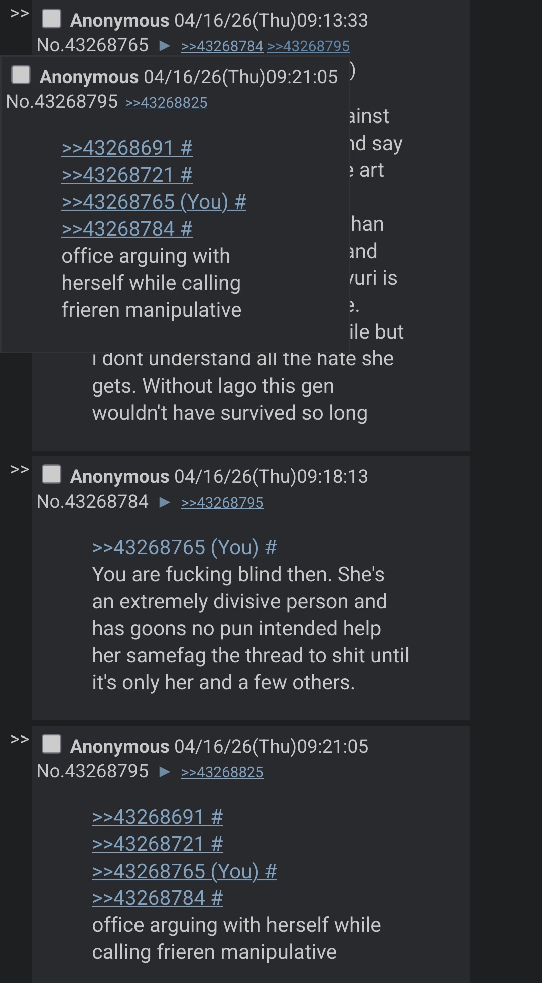 >>43271980You’re the same person who was talking to frieren and making fun of me with her.