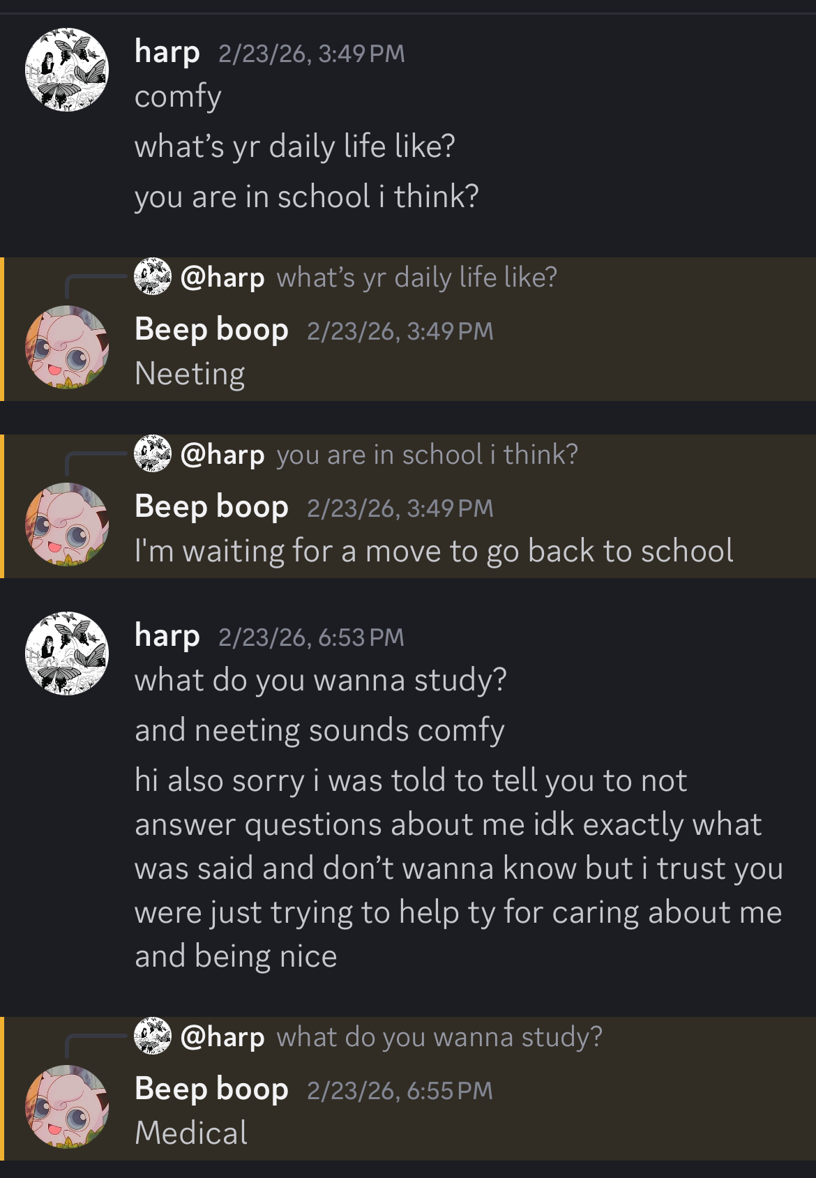 also to clarify i defended you to frieren but she also was never making fun of you but she did not want you in the server still. i was defending you saying you were young and will do better