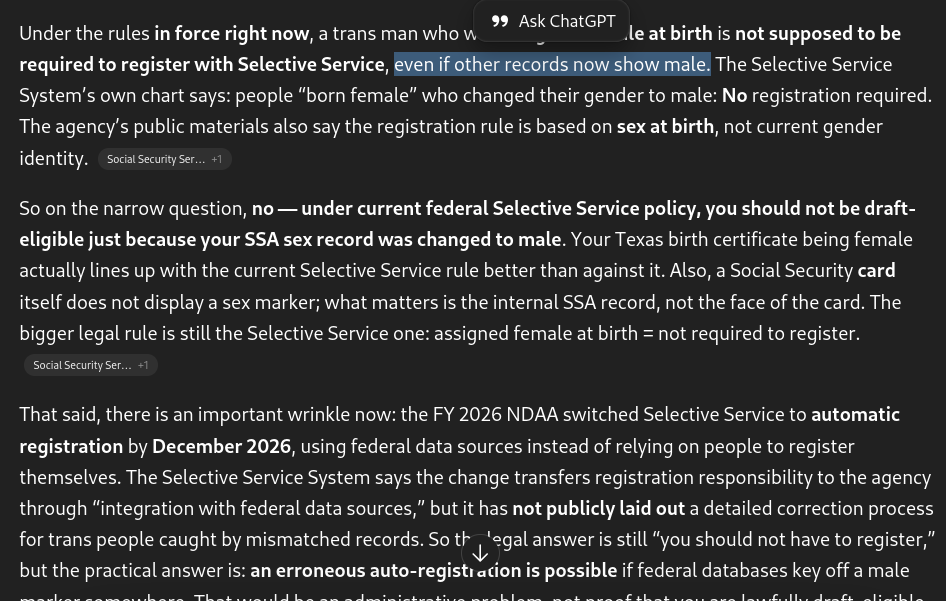 >>43276151I am FtM and was sent a SS notice when I got my ID. My birth cert is F (Because I cannot change it because I was born in Texas), but I changed my name and sex on my social security card before it was banned. Would not be surprised if this meant I would automatically be enlisted, as my only surviving female document is state owned, not federal.
