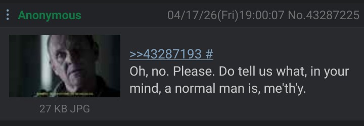 >>43286568every time someone hot posts here the usual suspects seethe until they stop this thread is basically dead until they kill themselves