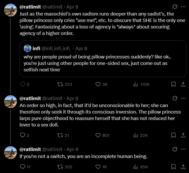>>43293660This is 'unironically' every """submissive""". They will cry and shit and piss and claim actually they are different but in every single instance they demand someone else perform a role for their sexual pleasure - objectively an act of dominance. a TRUE submissive would do whatever their partner wanted, INCLUDING larping as dominant or even skipping the sex stuff entirely and working to sustain their partners hedonistic lifestyle, if they were to ask for that.