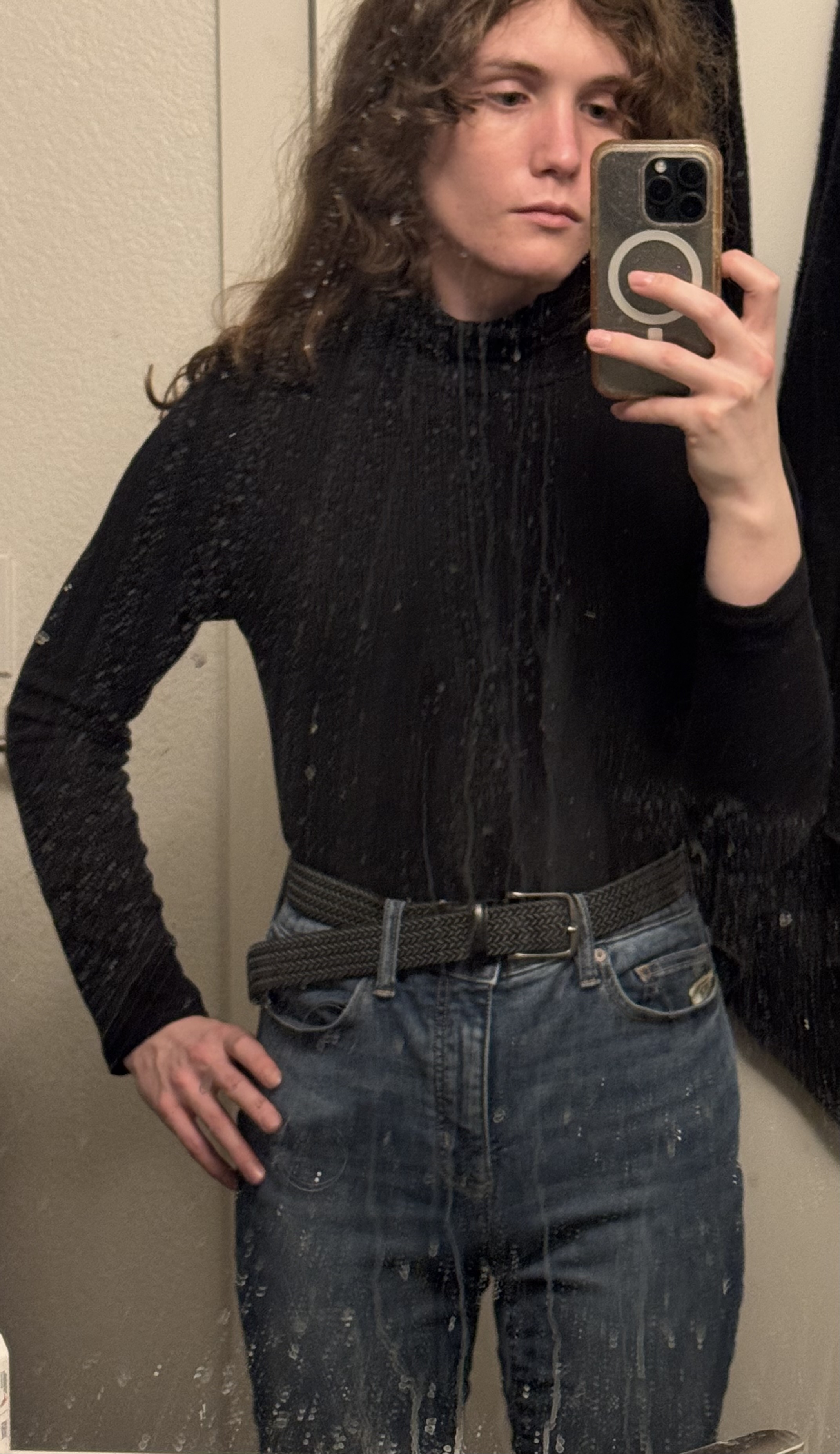 Quite a long/gaunt face and blocky chin, which seems like it'd be clocky. Still pretty though and your hair definitely helps.