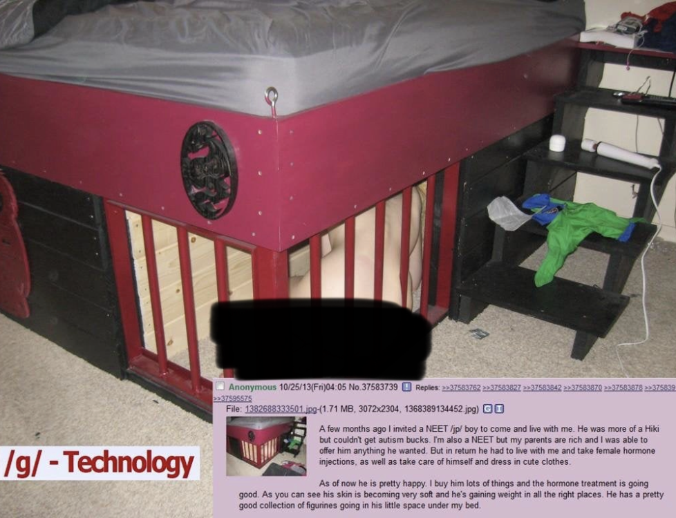>>43330409it was a cute little guy from /jp/ and he was keeping him under his bed in a cage and giving him feminizing hormones and giving him toys to play with and it was hot and giwtwm