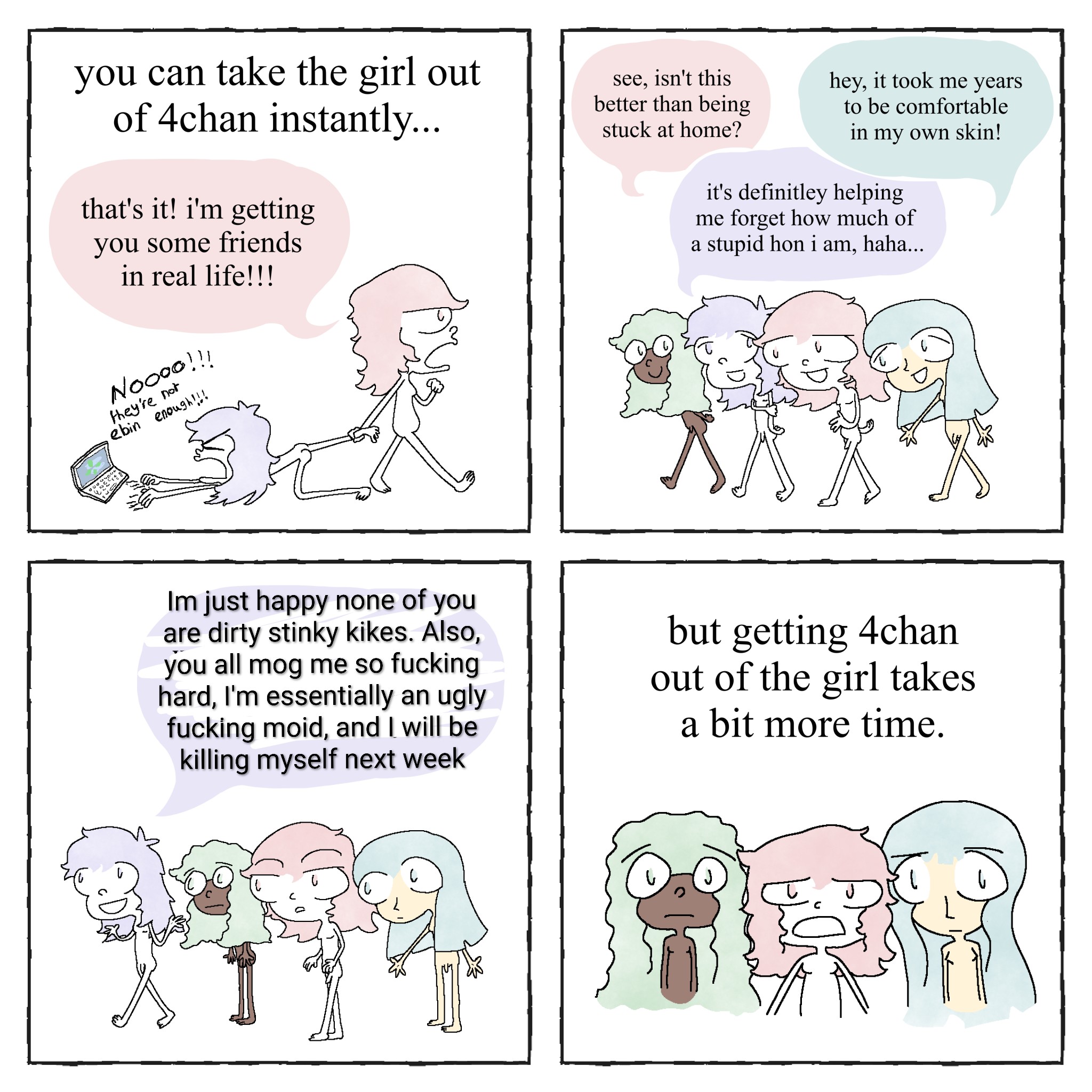 The vast majority of 4tranners arent bigoted neo nazis. Comics like in OP picrel are just made up scenarios for neurotypical passing transwomen to use to justify their bullying and ridicule of the mentally ill, struggling, non-passing trans people on 4chan.