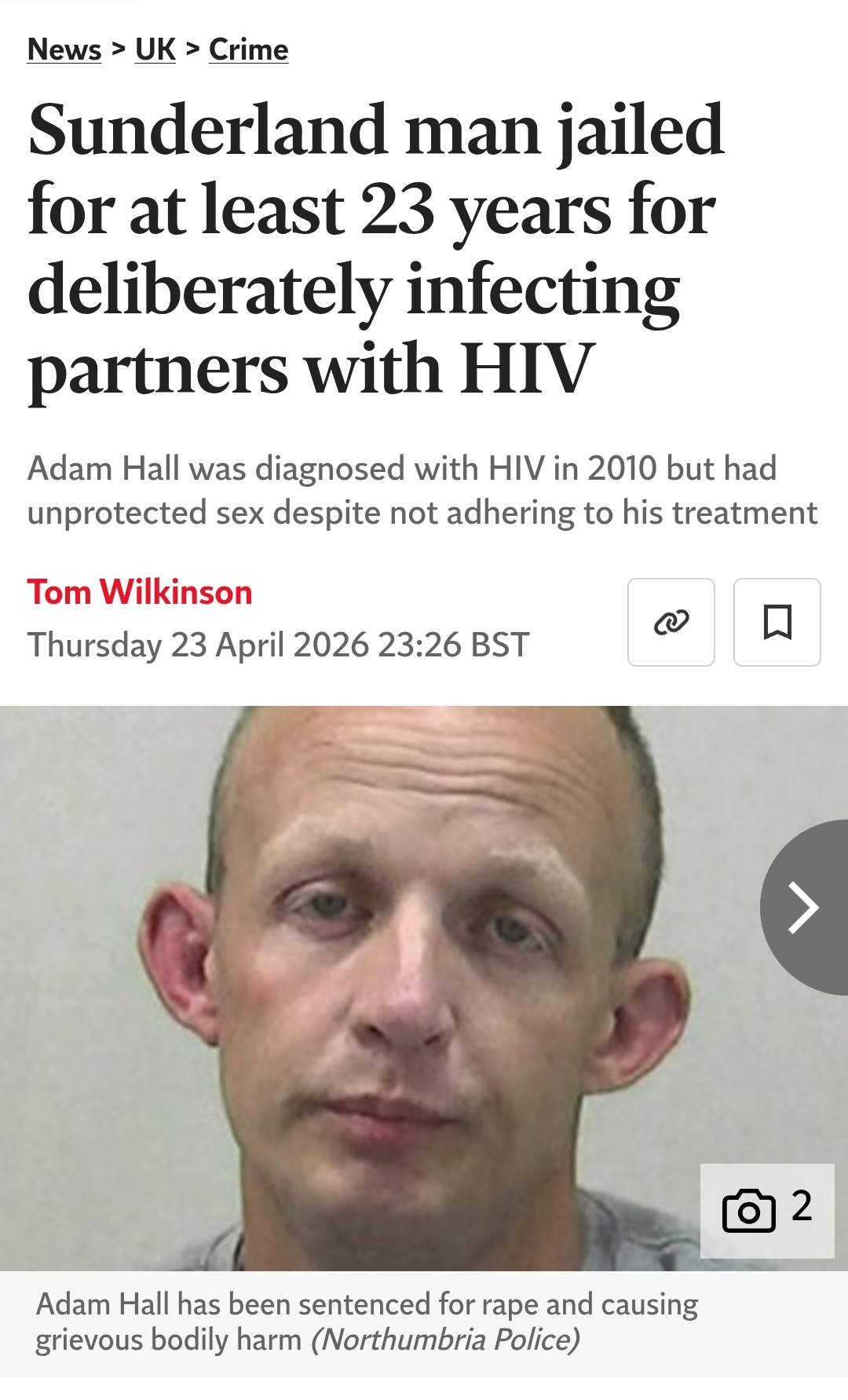 >A man has been jailed for life, with a minimum term of 23 years, for deliberately infecting sexual partners with HIV and raping some of his victims. Adam Hall, 43, was sentenced at Newcastle Crown Court on Thursday.>Hall, from Donvale Road, Washington, Tyne and Wear, was convicted in March of seven counts of causing grievous bodily harm and five counts of rape following a three-and-a-half month trial at the same court.