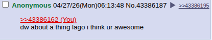 >>43386162dw about a thing lago i think ur awesome