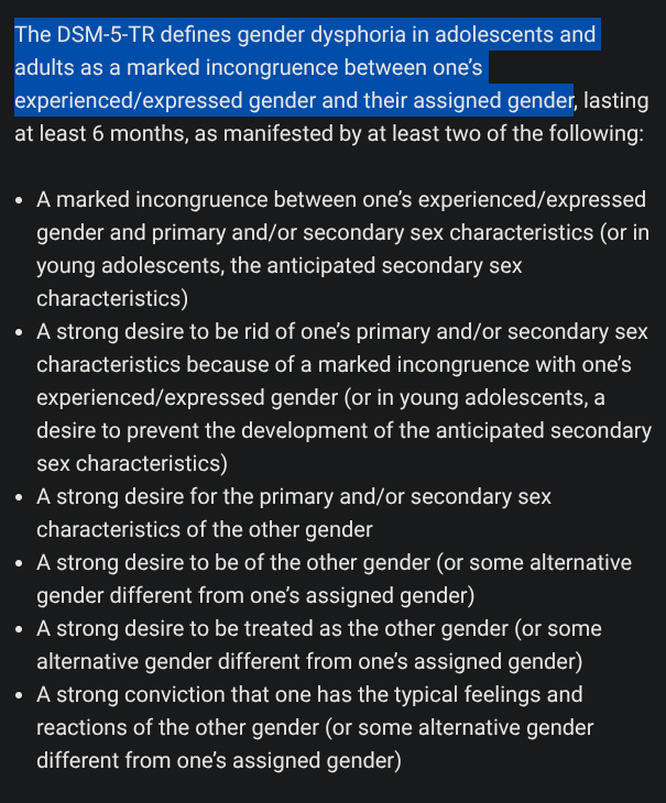 >>43374325We’re in agreement, then: distress at one’s endogenous sexual characteristics ≠ “incongruence between one’s experienced/expressed gender and their assigned gender”.