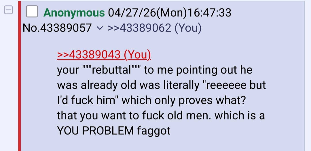 >>43389043your """rebuttal""" to me pointing out he was already old was literally "reeeeee but I'd fuck him" which only proves what? that you want to fuck old men. which is a YOU PROBLEM faggot