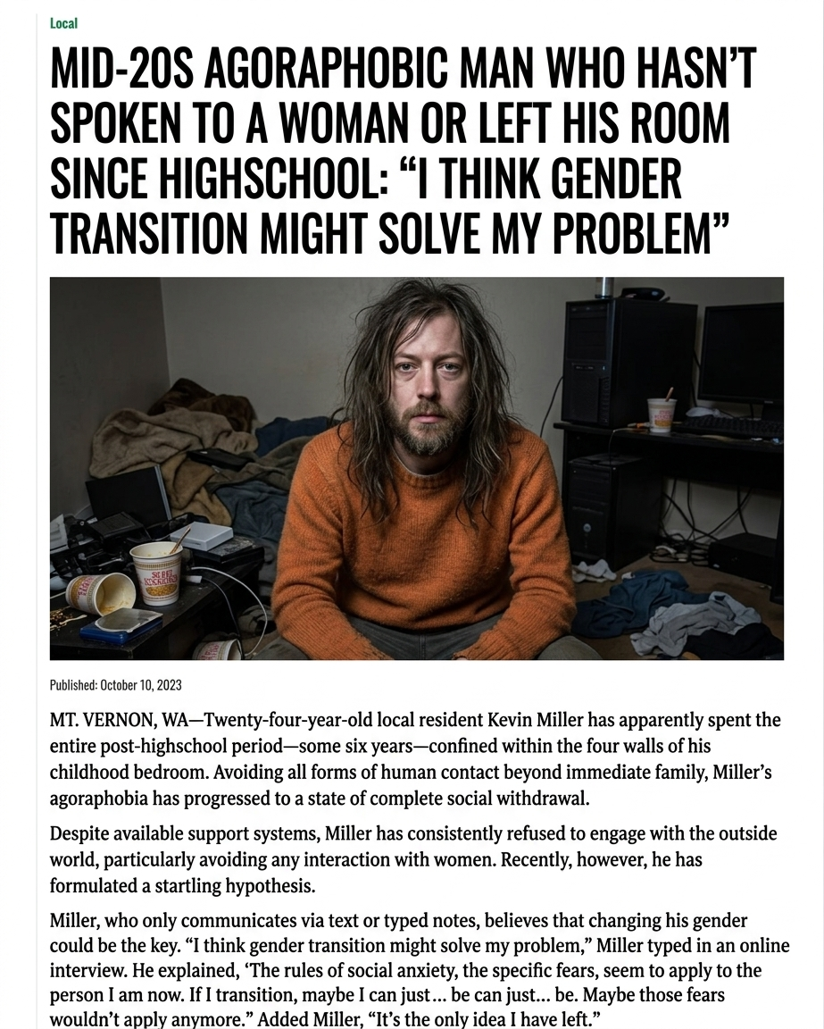 i wanna just be a normal person so bad but if i try and be a man i will literally kms. so i have to pretend i want to be a woman, oh my god