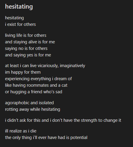 hesitatingi exist for othersliving life is for othersand staying alive is for mesaying no is for othersand saying yes is for meat least i can live vicariously, imaginativelyim happy for themexperiencing everything i dream oflike having roommates and a cator hugging a friend who's sadagoraphobic and isolatedComment too long. Click here to view the full text.