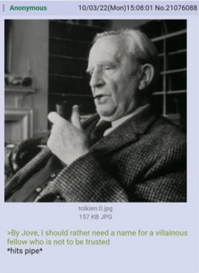 >>24846292I agree that the fanbase is terrible. Tolkien isn't a hack writer and LotR is not a bad book, but it's a good book for children and adults enjoying it is a red flag.I read LotR at age 8 and I liked it at the time. That's probably the appropriate age for it.Adult fans of LotR, more broadly high fantasy in general, are something I'll never understand.