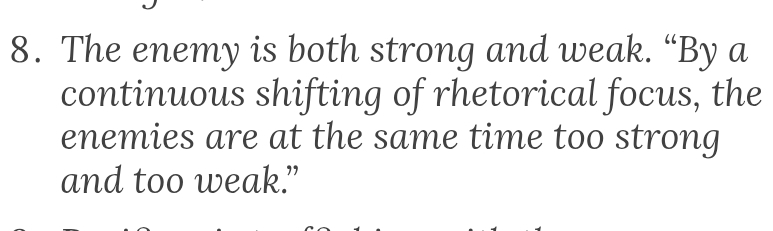 >>25183105>It’s classic externalization: instead of asking “what could I improve?”, he blames biology, society, and imaginary “low-IQ rivals.”Reminds me of this essay by Umberto Eco:https://www.nybooks.com/articles/1995/06/22/ur-fascism/>8. The followers must feel humiliated by the ostentatious wealth and force of their enemies. When I was a boy I was taught to think of Englishmen as the five-meal people. They ate more frequently than the poor but sober Italians. Jews are rich and help each other through a secret web of mutual assistance. However, the followers must be convinced that they can overwhelm the enemies. Thus, by a continuous shifting of rhetorical focus, the enemies are at the same time too strong and too weak. Fascist governments are condemned to lose wars because they are constitutionally incapable of objectively evaluating the force of the enemy.
