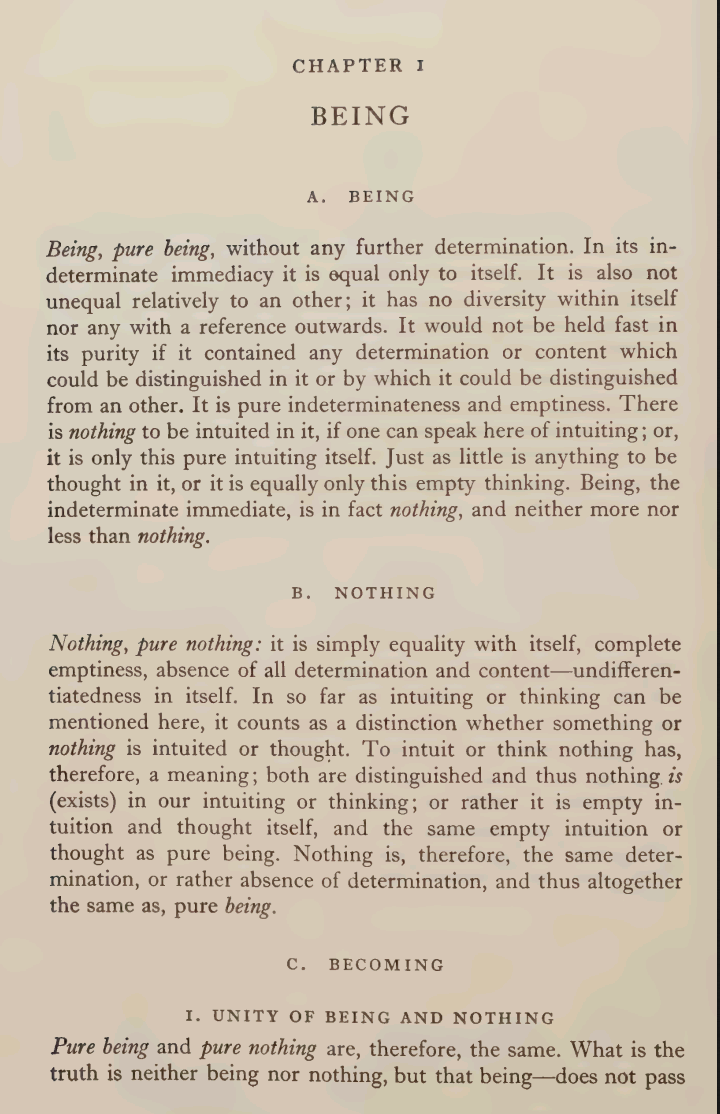 What exactly is "dialectic" as a theory of ontology? This is a reading group to learn just that>The splitting of a single whole and the cognition of its contradictory parts (see the quotation from Philo on Heraclitus at the beginning of Section III, “On Cognition,” in Lasalle’s book on Heraclitus) is the essence (one of the “essentials,” one of the principal, if not the principal, characteristics or features) of dialectics. That is precisely how Hegel, too, puts the matter (Aristotle in his Metaphysics continually grapples with it and combats Heraclitus and Heraclitean ideas).-Lenin, "On the Question of Dialectics">Space is, in general, pure quantity, no longer in its merely logical determination, but as an immediate and external being. Consequently, nature begins with quantity and not with quality, because its determination is not a primary abstract and immediate state like logical Being. -Hegel, "The Philosophy of Nature">Contrary to metaphysics, dialectics holds that nature is not a state of rest and immobility, stagnation and immutability, but a state of continuous movement and change, of continuous renewal and development, where something is always arising and developing, and something always disintegrating and dying away.-Stalin, "Dialectical and Historical Materialism">The fact is that no contradictory aspect can exist in isolation. Without its opposite aspect, each loses the condition for its existence. Just think, can any one contradictory aspect of a thing or of a concept in the human mind exist independently? Without life, there would be no death; without death, there would be no life. Without ‘above’, there would be no ‘below’, without ‘below’, there would be no ‘above’. Without misfortune, there would be no good fortune; without good fortune, there would be no misfortune. Without facility, there would be no difficulty; without difficulty, there would be no facility.Comment too long. Click here to view the full text.