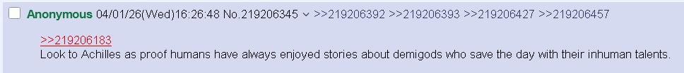 >Look to Achilles as proof humans have always enjoyed stories about demigods who save the day with their inhuman talents.is this true, /lit/? how did achilles "save the day" again?