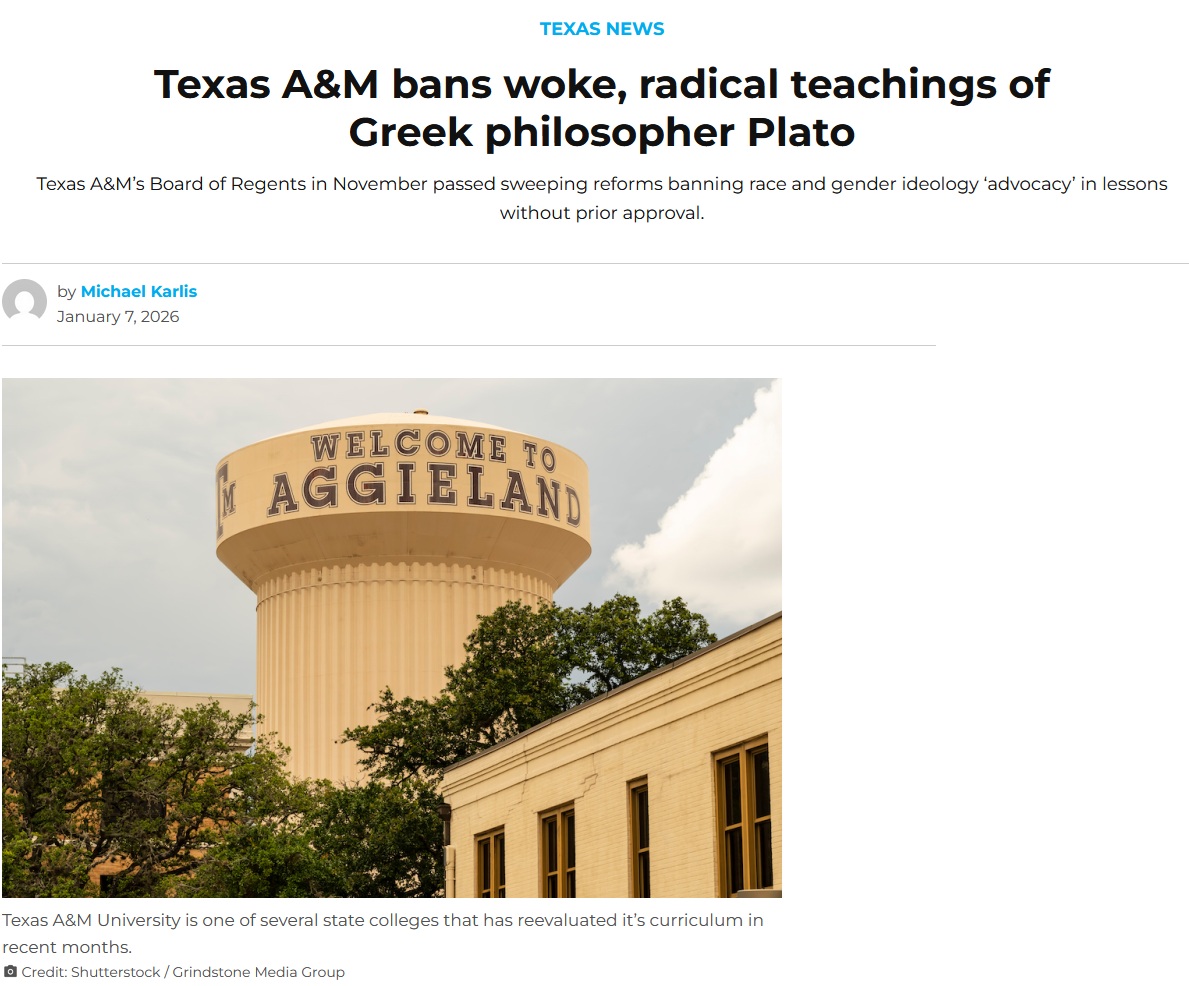 The part in Symposium where Aristophanes explains the origin of gender made A&M mad. We are witnessing the decline of Western civilization, in real timehttps://www.sacurrent.com/news/texas-news/texas-am-bans-radical-woke-teachings-of-greek-philosopher-plato/