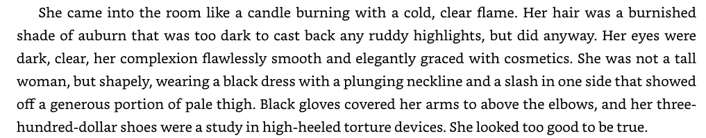 >>25213634Yes.An excerpt from the first Dresden File's book, which people like to point to as an example of male-gazey writing, for comparison.