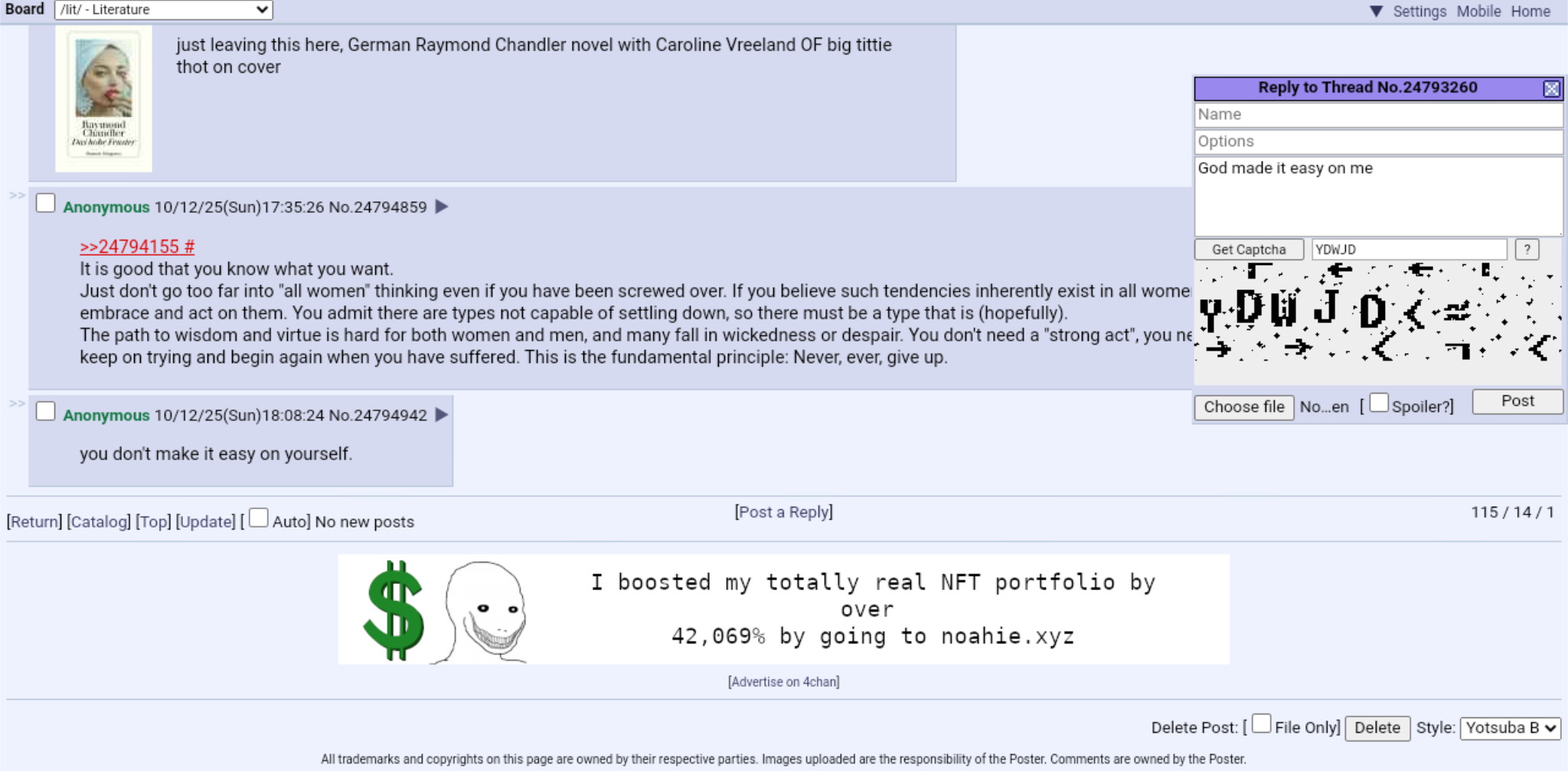 >>24793260The number one advice I have for /lit/bros that cannot get girls is to seriously try your hand at poetry and prose and maybe even publishedNot kidding. I've been with 7 chicks and 5 of em were after I shared the link to my poetry/stories in a lit magOne chick was an absolute retard too but she felt I felt she was smart so she felt great having sex with me. Women are so fkn retarded bros