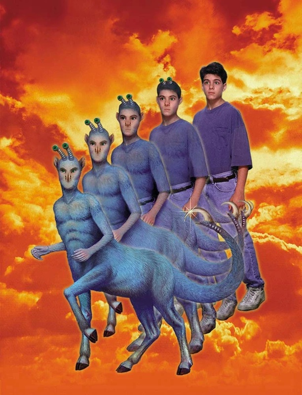"...Nessus wasn't trotting. He came tippy-toe, circling a four-foot chrome-yellow feather with exaggerated wariness, moving one foot at a time, while his flat heads darted this way and that. He had almost reached the lecture dome when something like a large black butterfly settled on his rump. Nessus screamed like a woman, leapt forward as if clearing a high fence. He landed rolling. When he stopped rolling he remained curled into a ball, with his back arched and his legs folded and his heads and necks tucked between his forelegs..."