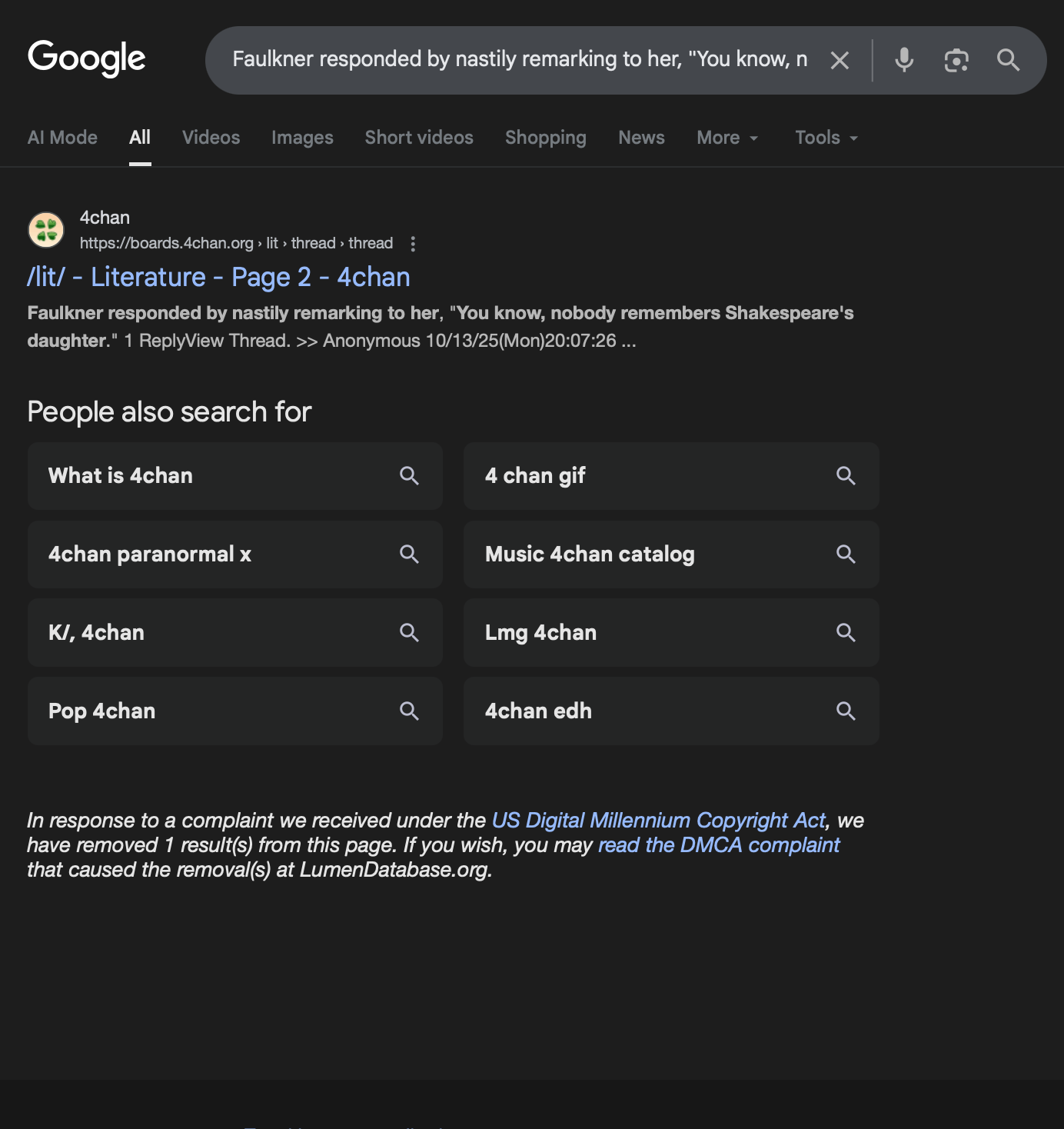 >>24798690>>An ever-improving alcoholic, Faulkner was once begged by his daughter not to get drunk on her birthday. Faulkner responded by knowingly remarking to her, "You know, nobody remembers Shakespeare's daughter."hmmm