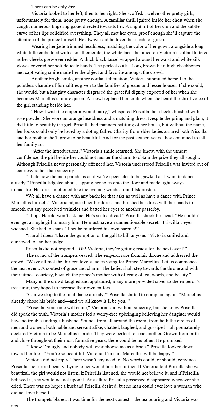 >>24813509The line Victoria's mother led a worry-free upbringing believing her daughter would have no trouble finding a husband you can change husband to suitor and it would flow better. Tiny change to the prose.
