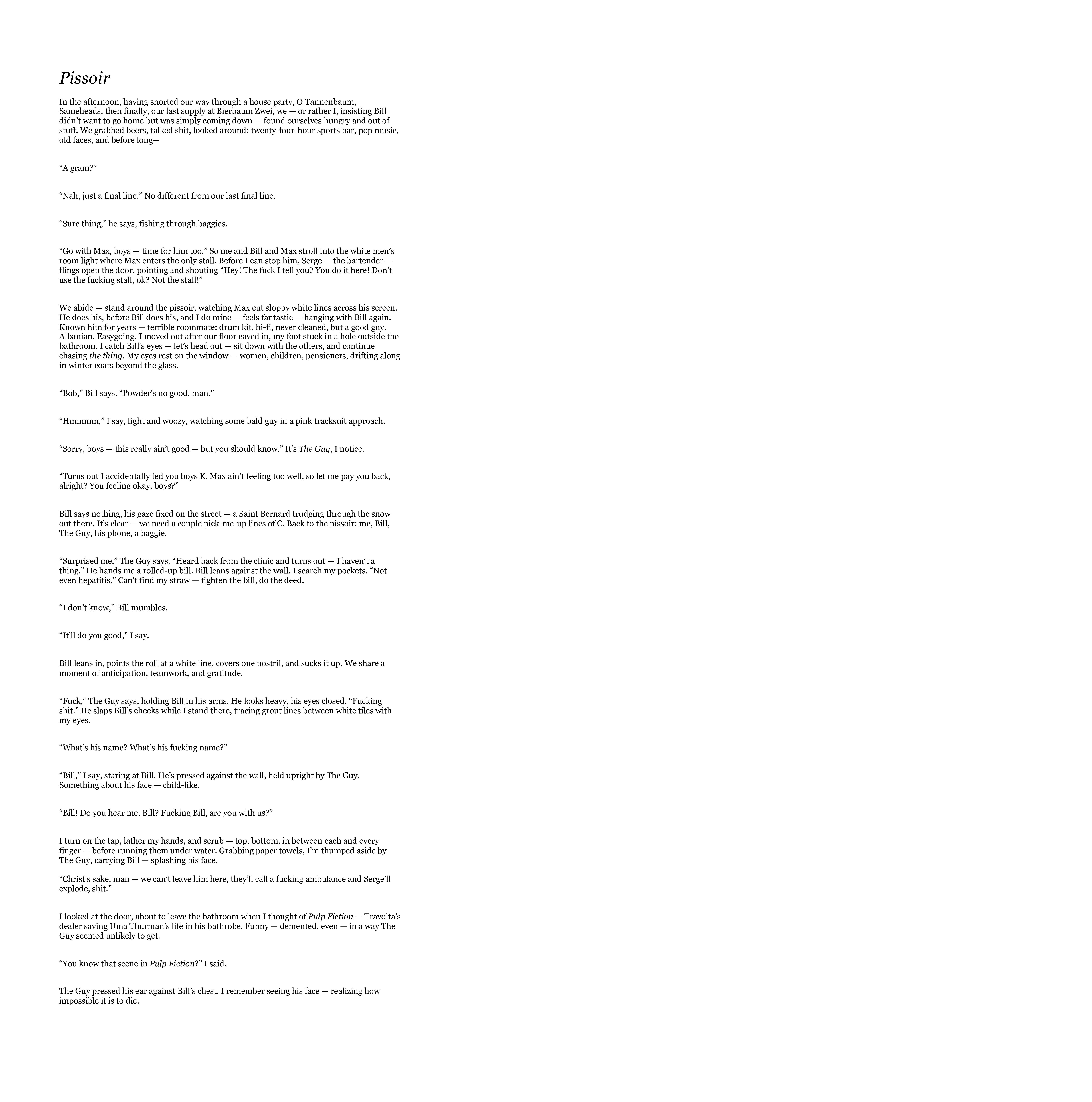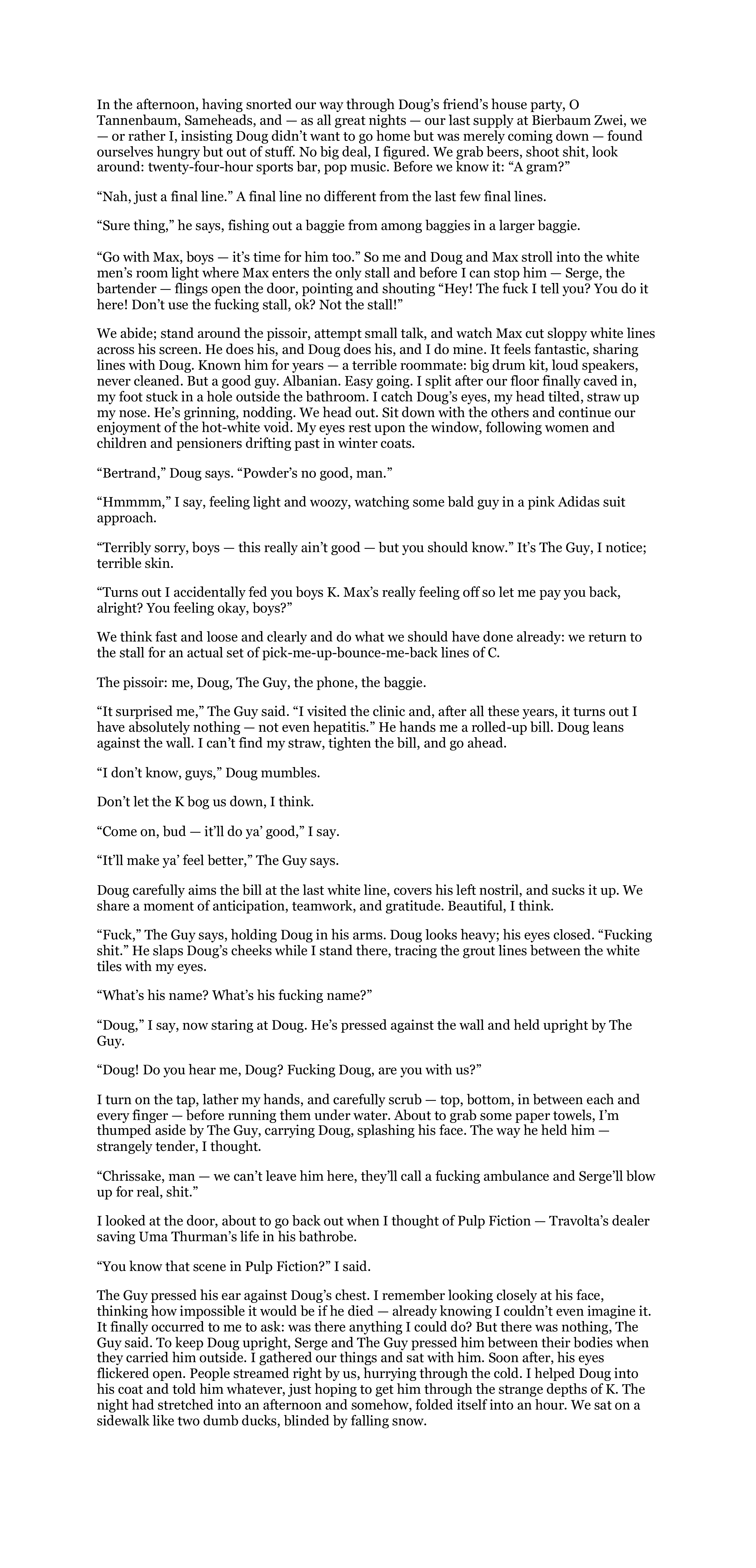 >>24813721The prose is better, actually decent enough. Now it's just a matter of okay, what next? A bunch of morons doing drugs in a bathroom and one of them OD's isn't something that can't be in a story, but it's also not particularly interesting. One suggestion:Why does he mention Pulp Fiction, twice, if there's no acknowledgement or response at all? First, I'd drop the "he thought of that scene" line entirely. The dialogue is plenty for the reference, and actually increases the "dumb guy panicking and saying stupid shit" theme more than if he thinks about it first. Second, have some kind of response to it. "I've never seen it." Or"What the fuck are you talking about, Dave?" Or something. As ir right now, we just have a reference to a movie... and nothing. It just sits there, comparing itself to your scene with no context and no purpose to your scene. Either use it show the narrator is a dumbass or use it to contrast the events. Don't just remind us that Tarantino is really good, because Tarantino being good doesn't do anything for you.