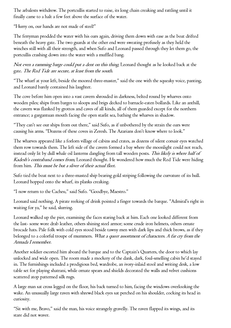>>24822415Amateurish, in the way that you just need to write and read more.>I watched the shadow crawl across the sand. "I watched" is weak google "filtering phrases">The black shade tethered to the Pillar of Creation always circling.sentence fragment>That stretch of night, a constant reminder that darkness is bound to all things.another sentence fragmentI don't think these are artistic sentence fragments. I think you are omitting the word "was" because you have (correctly) identified that it's repetitive. The real solution is to add actual variation and focus the sentence around the central thing being conveyed.Sincerely, I recommend spending a week or two going through a grammar book. If you want to write like this, you need to really understand the parts of speech and the different ways you can arrange them.
