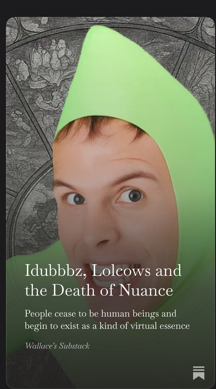 Wrote an article about Idubbbz, lolcows and dehumanization. Would like any feedback you have. https://open.substack.com/pub/wallacemack/p/idubbbz-lolcows-and-the-death-of?utm_campaign=post&utm_medium=web