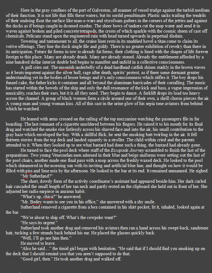 >>24816621'its long chain creaking and rattling' -> 'its long chain creaked and rattled, until it fell short of touching the water's surface'. Rework all the present tenses a little more. Maybe it could be better to rework the monologue so he says it outward and make it more lively with him interacting with the others through dialogue. Maybe, just me. I try to rein in monologuing if I can help it if a character isn't alone, myself. I thought this was a nice piece overall.