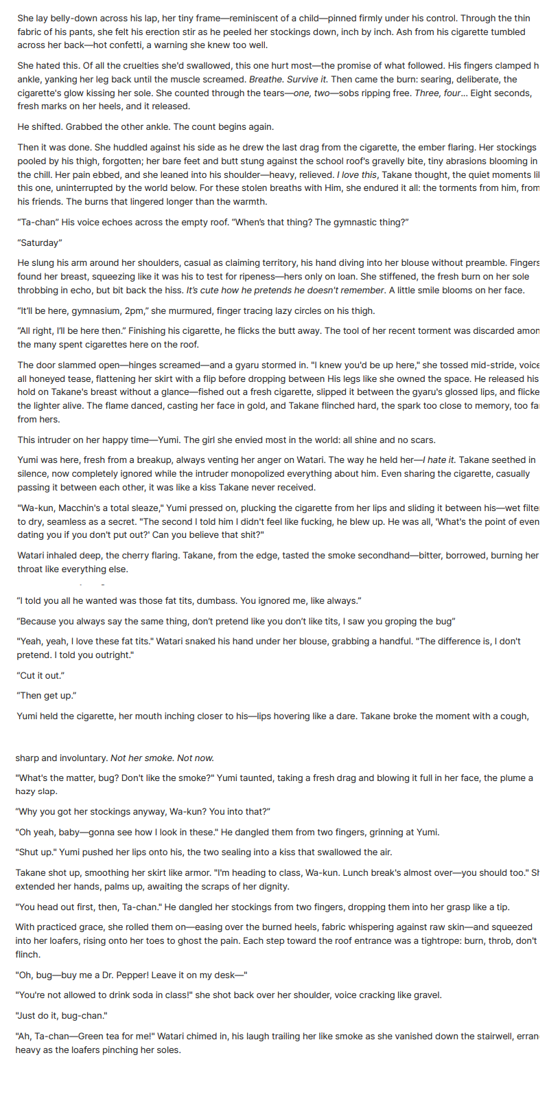 >>24823080Very well written. I hate it though. She should just push him off the roof and the world would be a better place. I wouldn't read it, unless I thought this ended up in revenge of some kind. Unless the guy is the MC. Then I'd consider reading.