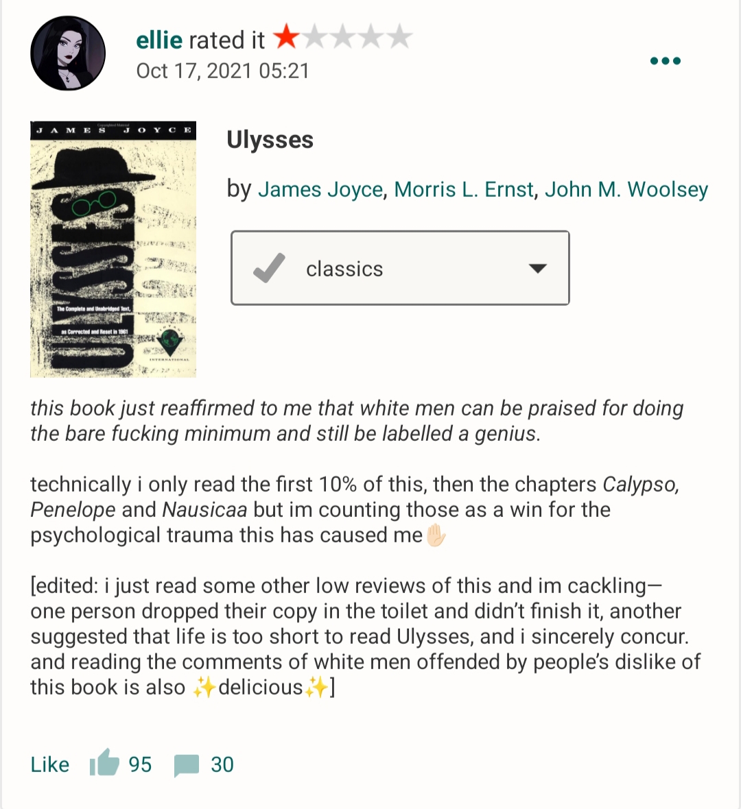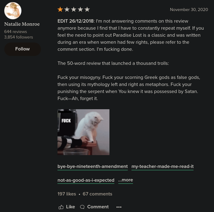 I don't think the unwashed masses should even be allowed to present their critiques of art. This woman seeks only to tear down the foundations; to destroy everything that came before and that is beautiful, so that everything may be ugly like her. You see it on Letterboxd, you see it on GoodReads, they all either want to shit on anything held in high esteem or make quippy, smug, meme-reviews using gay terminology for updoots sake. For example of the latter, a review of Barry Lyndon with over 800 likes: "Twink on twink violence." A review of The Lord of The Rings: The Fellowship of the Ring, "sometimes a fellowship is just six himbos two daddys and a gimli." That review has 5,000+ likes.