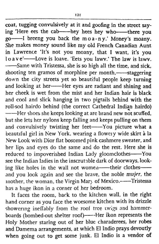 Very good work if you want to see the enjambment of Kerouac's fiction into fact. It transitions from the beautiful to the ugly and back and forth as he tries to find enlightenment. A wonderful work if you enjoy Kerouac, maybe not the first work I would recommend for him but it exhibits why people were interested in him. A life lived in a sordid manner in a brilliant way. People abandoned social mores to pursue his chemical mysticism. If you want to do a fun experiment, at a certain point the character of Tristessa heads to Desolation Peak. At that point I like to suggest reading Desolation Angels to simulate his aimless abandon before going back and finishing Tristessa. That of course is a novel way to read it, but one that I think gave me some insight into the character.